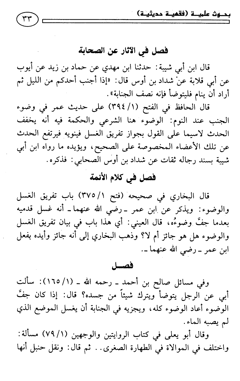 قال الحافظ في «الفتح» (1/ 394) على حديث عمر في وضوء الجنب عند النوم: الوضوء هنا الشرعي والحكمة فيه أنه يخفف الحدث لاسيما على القول بجواز تفريق الغسل فينويه فيرتفع الحدث عن تلك الأعضاء المخصوصة على الصحيح، ويؤيده ما رواه ابن أبي شيبة بسند رجاله ثقات عن شداد بن أوس الصحابي: فذكره.
