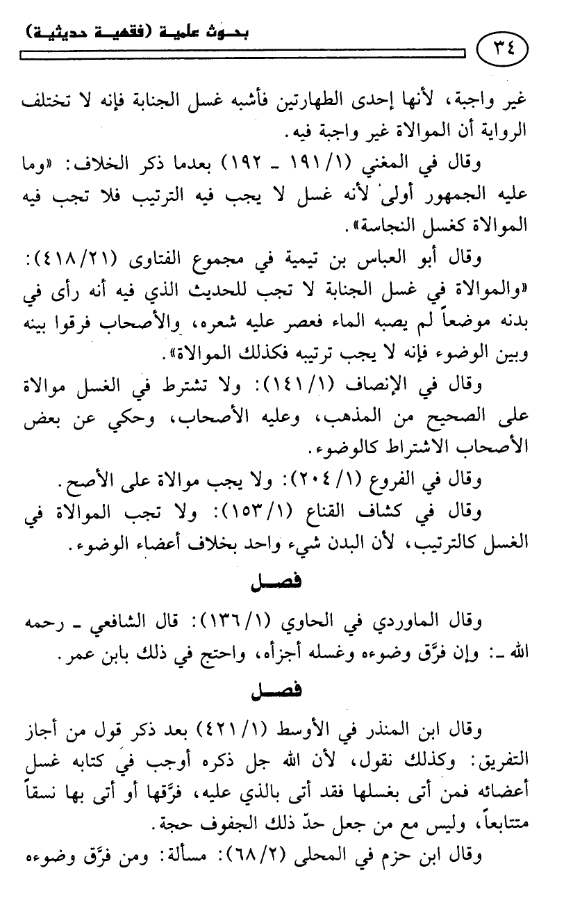 وقال في «المغني» (1/ 191 - 192) بعدما ذكر الخلاف: «وما عليه الجمهور أولى؛ لأنه غسل لا يجب فيه الترتيب فلا تجب فيه الموالاة كغسل النجاسة».
