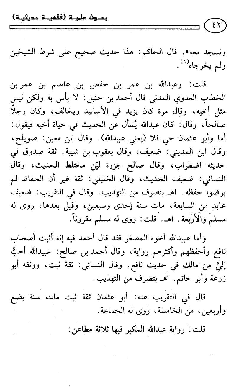 قلت: وعبد الله بن عمر بن حفص بن عاصم بن عمر بن الخطاب العدوي المدني قال أحمد بن حنبل: لا بأس به ولكن ليس مثل أخيه، وقال مرة كان يزيد في الأسانيد ويخالف، وكان رجلًا صالحًا، وقال: كان عبد الله يُسأل عن الحديث في حياة أخيه فيقول: أما وأبو عثمان حي فلا -يعني عبيد الله-. وقال ابن معين: صويلح، وقال ابن المديني: ضعيف، وقال يعقوب بن شيبة: ثقة صدوق في حديثه اضطراب، وقال صالح جزرة ليّن مختلط الحديث، وقال النسائي: ضعيف الحديث، وقال الخليلي: ثقة غير أن الحفاظ لم يرضوا حفظه. اهـ. بتصرف من «التهذيب». وقال في «التقريب»: ضعيف عابد من السابعة، مات سنة إحدى وسبعين، وقيل بعدها، روى له مسلم والأربعة. اهـ. قلت: روى له مسلم مقرونًا.