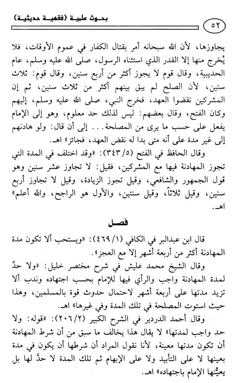 وقال أحمد الدردير في «الشرح الكبير» (2/ 206): («قوله: ولا حد واجب لمدتها» لا يقال هذا يخالف ما سبق من أن شرط المهادنة أن تكون مدتها معينة، لأنا نقول المراد أن شرطها أن يكون في مدة بعينها لا على التأبيد ولا على الإبهام ثم تلك المدة لا حدَّ لها بل يعيُّنها الإمام باجتهاده) اهـ.