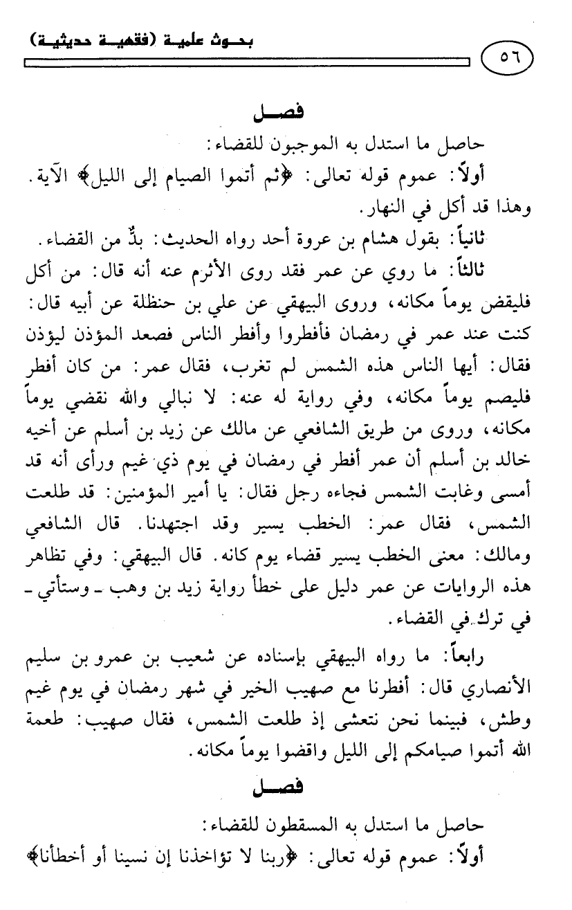 ثالثًا: ما روي عن عمر فقد روى الأثرم عنه أنه قال: من أكل فليقض يومًا مكانه، وروى البيهقي عن علي بن حنظلة عن أبيه قال: كنت عند عمر في رمضان فأفطروا وأفطر الناس فصعد المؤذن ليؤذن فقال: أيها الناس هذه الشمس لم تغرب، فقال عمر: من كان أفطر فليصم يومًا مكانه، وفي رواية له عنه: لا نبالي والله نقي يومًا مكانه، وروى من طريق الشافعي عن مالك عن زيد بن أسلم عن أخيه خالد بن أسلم أن عمر أفطر في رمضان في يوم ذي غيم ورأى أنه قد أمسى وغابت الشمس فجاءه رجل فقال: يا أمير المؤمنين! قد طلعت الشمس، فقال عمر: الخطب يسير وقد اجتهدنا. قال الشافعي ومالك: معنى الخطب يسير قضاء يوم مكانه. قال البيهقي: وفي تظاهر هذه الروايات عن عمر دليل على خطأ رواية زيد بن وهب - وستأتي - في ترك القضاء.