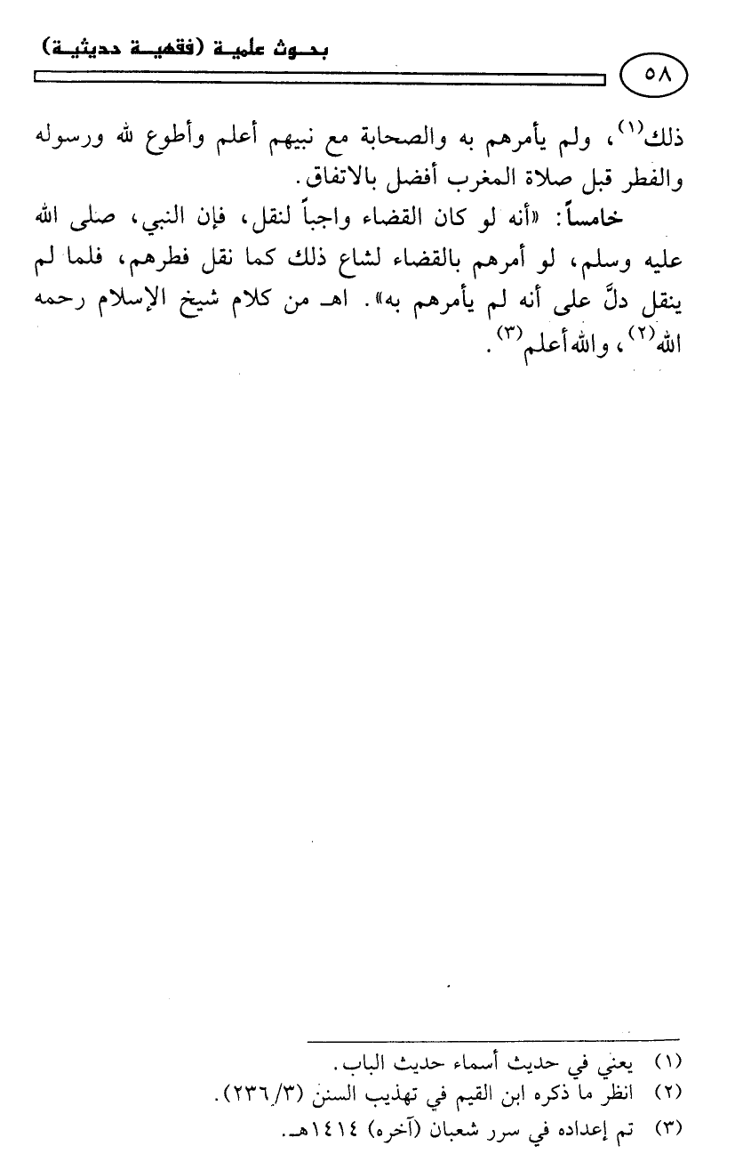 خامسًا: (أنه لو كان القضاء واجبًا لنقل، فإن النبي - صلى الله عليه وسلم - لو أمرهم بالقضاء لشاع ذلك كما نقل فطرهم، فلما لم ينقل دلَّ على أنه لم يأمرهم به) اهـ. من كلام شيخ الإسلام - رحمه الله - (¬2)، والله أعلم (¬3).