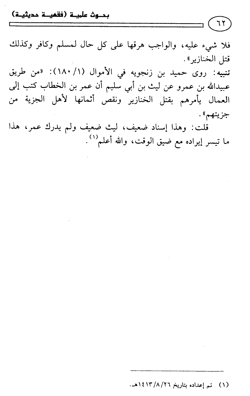 تنبيه: روى حميد بن زنجويه في «الأموال» (1/ 180): (من طريق عبيد الله بن عمرو عن ليث بن أبي سليم أن عمر بن الخطاب كتب إلى العمال يأمرهم بقتل الخنازير ونقص أثمانها لأهل الجزية من جزيتهم).