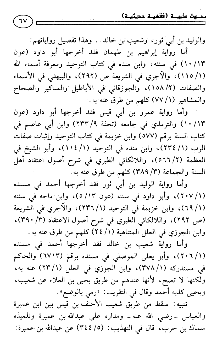 وأما رواية الوليد بن أبي ثور فقد أخرجها أحمد في «مسنده» (1/ 207)، وأبو داود في سننه «عون» (13/ 5)، وابن ماجه في «سننه» (1/ 69)، وابن خزيمة في «التوحيد» (1/ 236)، والآجري في «الشريعة» ص [292]، واللالكائي، والطبري في «شرح أصول الاعتقاد» (3/ 390)، وابن الجوزي في «العلل المتناهية» (1/ 24) كلهم من طرق عنه به.