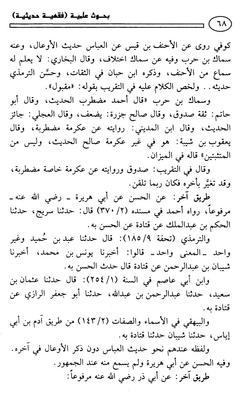 وسماك بن حرب «قال أحمد: مضطرب الحديث، وقال أبو حاتم: ثقة صدوق، وقال صالح جزرة: يضعف، وقال العجلي: جائز الحديث، وقال ابن المديني: روايته عن عكرمة مضطربة، وقال يعقوب بن شيبة: هو في غير عكرمة صالح الحديث، وليس من المتثبتين» قاله في «الميزان».