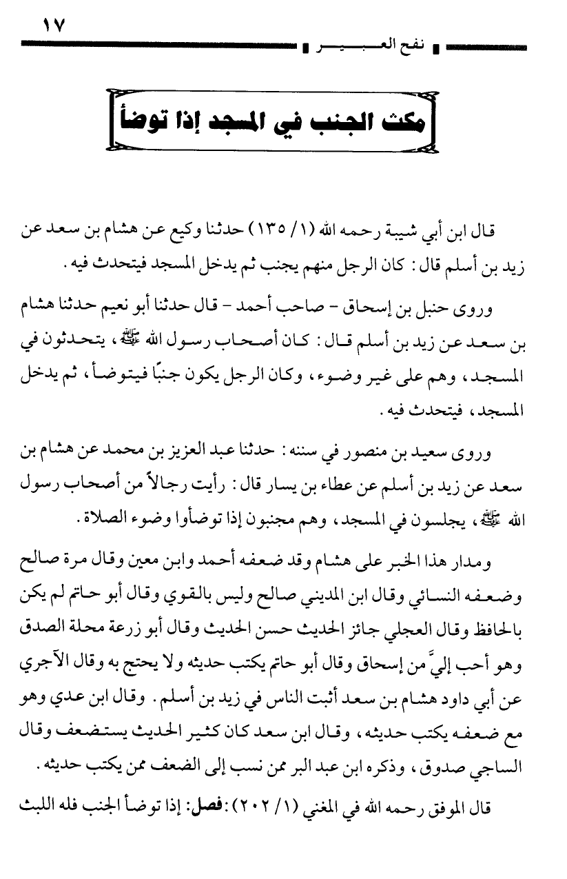 وروى حنبل بن إسحاق- صاحب أحمد- قال حدثنا أبو نعيم حدثنا هشام بن سعد عن زيد بن أسلم قال: كان أصحاب رسول الله - صلى الله عليه وسلم -، يتحدثون في المسجد، وهم على غير وضوء، وكان الرجل يكون جنبًا فيتوضأ، ثم يدخل المسجد، فيتحدث فيه.