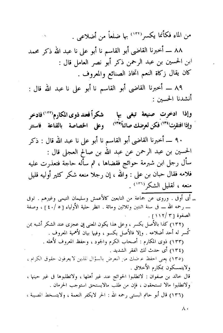 88 - أَخْبَرَنَا الْقَاضِي أَبُو الْقَاسِمِ، حَدَّثَنَا أَبُو عَلِيٍّ، حَدَّثَنَا عَبْدُ اللَّهِ، حَدَّثَنِي مُحَمَّدُ بْنُ الْحُسَيْنِ بْنِ عَبْدِ الرَّحْمَنِ، حَدَّثَنِي أَبُو نَصْرٍ الْعَامِلِيُّ قَالَ: " كَانَ §يُقَالُ: زَكَاةُ النَّعَمِ اتِّخَاذُ الصَّنَائِعِ وَالْمَعْرُوفِ "