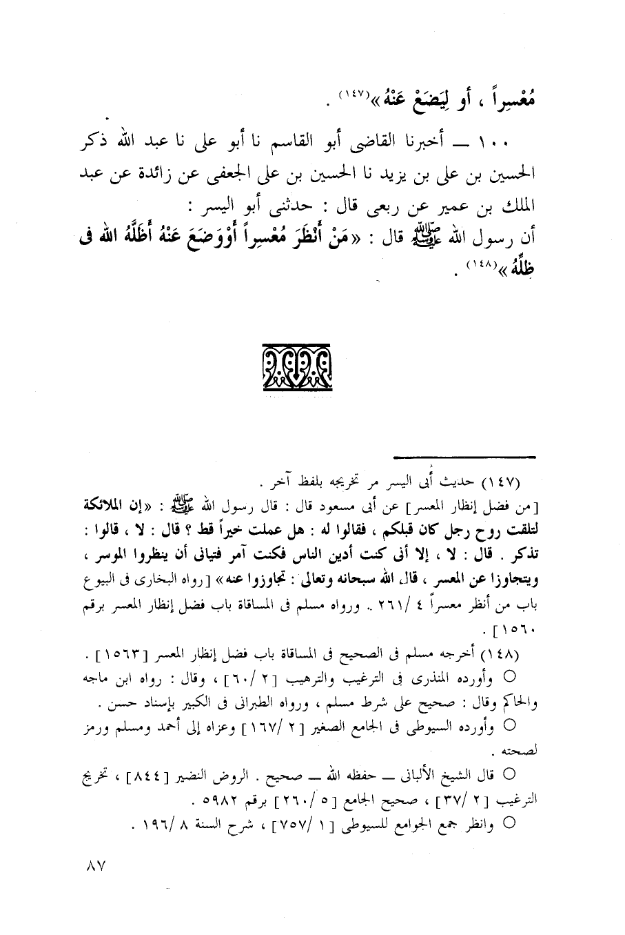 100 - أَخْبَرَنَا الْقَاضِي أَبُو الْقَاسِمِ، حَدَّثَنَا أَبُو عَلِيٍّ، حَدَّثَنَا عَبْدُ اللَّهِ، حَدَّثَنِي الْحُسَيْنُ بْنُ عَلِيِّ بْنِ يَزِيدَ، حَدَّثَنَا الْحُسَيْنُ بْنُ عَلِيٍّ الْجُعْفِيُّ، عَنْ زَائِدَةَ، عَنْ عَبْدِ الْمَلِكِ بْنِ عُمَيْرٍ، عَنْ رِبْعِيٍّ قَالَ: حَدَّثَنِي أَبُو الْيَسَرِ، أَنَّ رَسُولَ اللَّهِ صَلَّى اللهُ عَلَيْهِ وَسَلَّمَ، قَالَ: «§مَنْ أَنْظَرَ مُعْسِرًا أَوْ وَضَعَ عَنْهُ أَظَلَّهُ اللَّهُ فِي ظِلِّهِ»