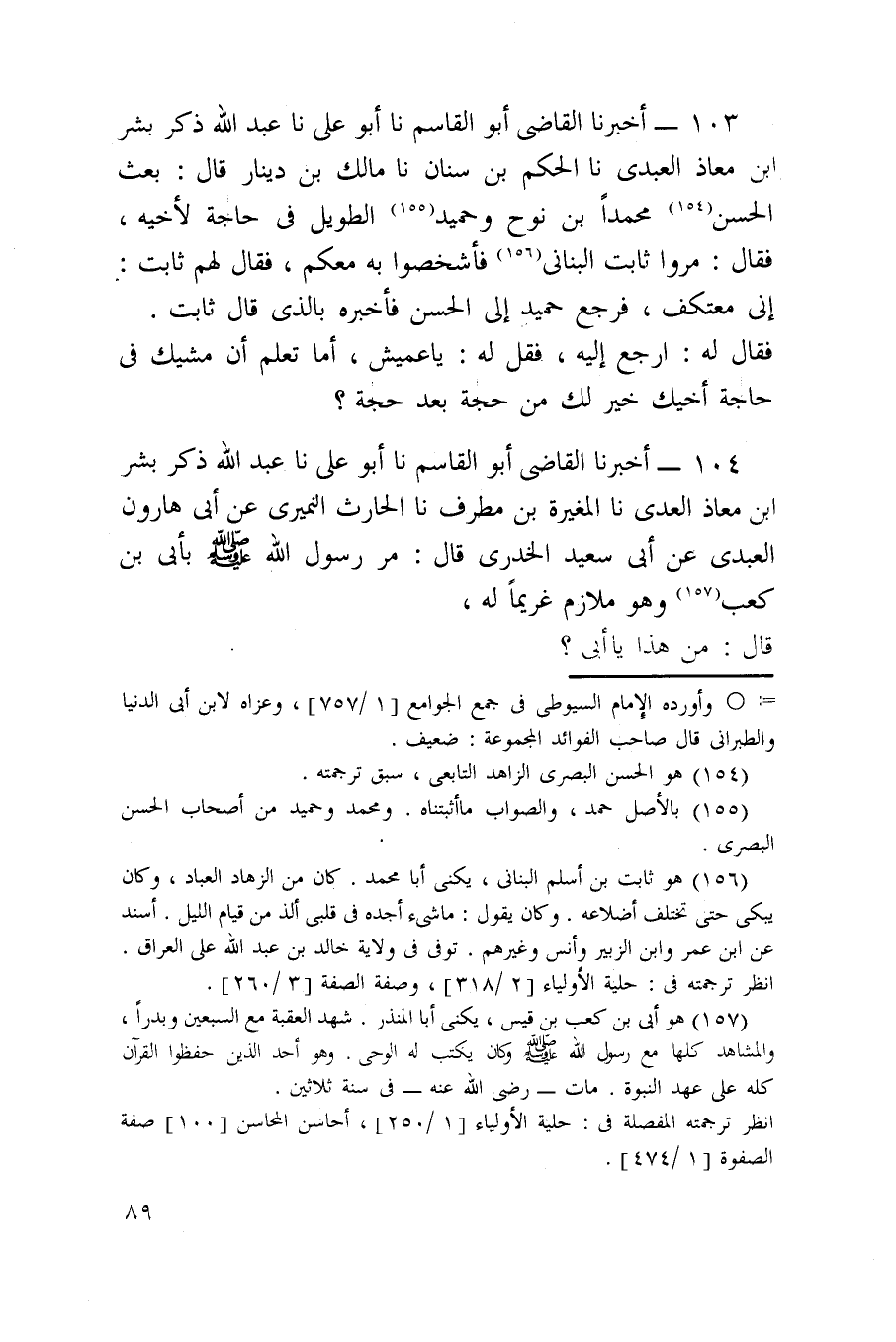 103 - أَخْبَرَنَا الْقَاضِي أَبُو الْقَاسِمِ، حَدَّثَنَا أَبُو عَلِيٍّ، حَدَّثَنَا عَبْدُ اللَّهِ، حَدَّثَنِي بِشْرُ بْنُ مُعَاذٍ الْعَقَدِيُّ، حَدَّثَنَا الْحَكَمُ بْنُ سِنَانٍ، حَدَّثَنَا مَالِكُ بْنُ دِينَارٍ قَالَ: بَعَثَ الْحَسَنُ مُحَمَّدَ بْنَ نُوحٍ، وَحُمَيْدًا الطَّوِيلَ فِي حَاجَةٍ لِأَخِيهِ، فَقَالَ: «مُرُوا ثَابِتًا الْبُنَانِيَّ فَأَشْخِصُوا بِهِ مَعَكُمْ» ، فَقَالَ لَهُمْ ثَابِتٌ: إِنِّي مُعْتَكِفٌ، فَرَجَعَ حُمَيْدٌ إِلَى الْحَسَنِ فَأَخْبَرَهُ بِالَّذِي قَالَ ثَابِتٌ، فَقَالَ لَهُ: " ارْجِعْ إِلَيْهِ فَقُلْ لَهُ: يَا عُمَيْشُ §أَمَا تَعْلَمُ أَنَّ مَشْيَكَ فِي حَاجَةِ أَخِيكَ خَيْرٌ لَكَ مِنْ حَجَّةٍ بَعْدَ حَجَّةٍ؟ "