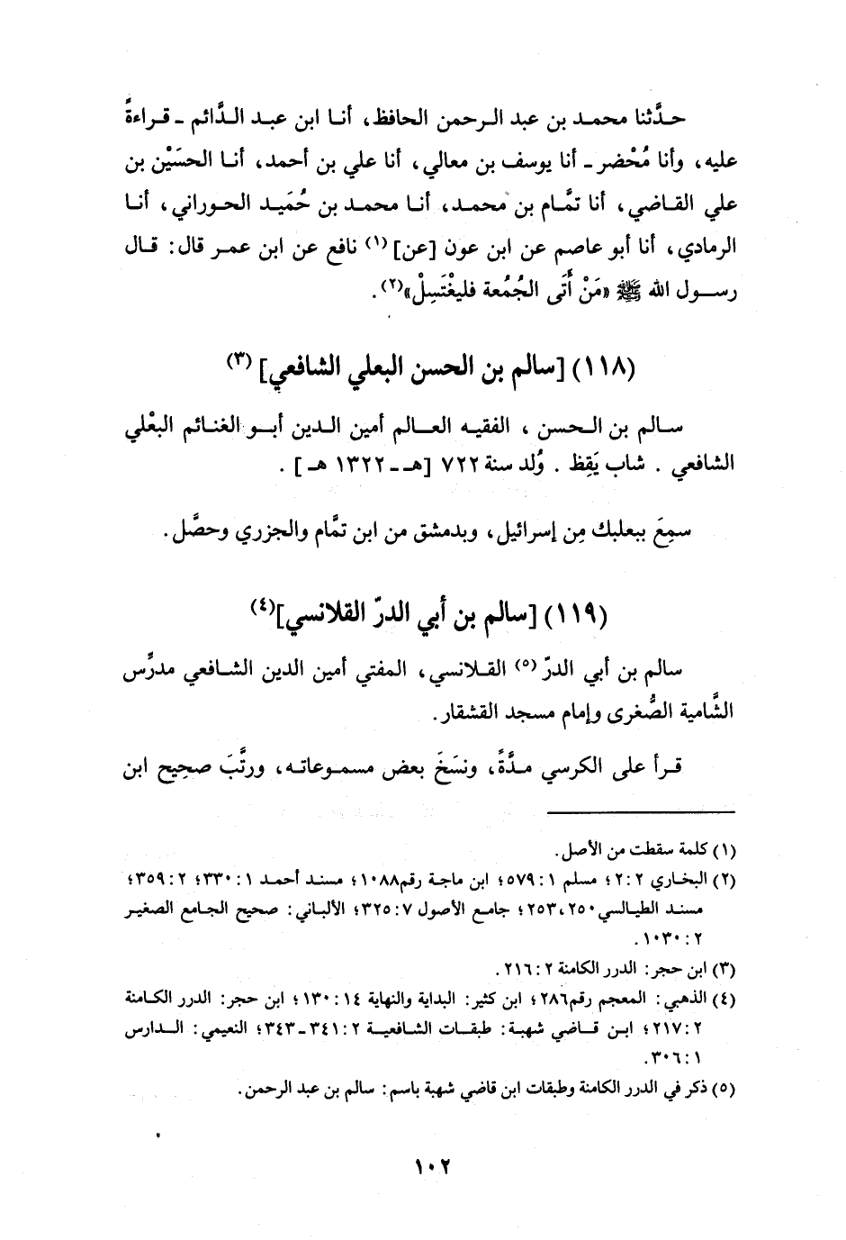 حَدَّثَنَا مُحَمَّدُ بْنُ عَبْدِ الرَّحْمَنِ الْحَافِظُ، أَنَا مُحَمَّدُ بْنُ عَبْدِ الدَّائِمِ قِرَاءَةً عَلَيْهِ، وَأَنَا مُحَضَرٌ، أَنَا يُوسُفُ بْنُ مَعَالِي، أَنَا عَلِيُّ بْنُ أَحْمَدَ، أَنَا الْحُسَيْنُ بْنُ عَلِيٍّ الْقَاضِي، أَنَا تَمَّامُ بْنُ مُحَمَّدٍ، أَنَا مُحَمَّدُ بْنُ حُمَيْدٍ الْحَوْرَانِيُّ، أَنَا الرَّمَادِيُّ، أَنَا أَبُو عَاصِمٍ، عَنِ ابْنِ عَوْنٍ، عَنْ نَافِعٍ، عَنِ ابْنِ عُمَرَ، قَالَ: قَالَ رَسُولُ اللَّهِ صَلَّى اللَّهُ عَلَيْهِ وَسَلَّمَ: «مَنْ أَتَى الْجُمُعَةَ فَلْيَغْتَسِلْ»
