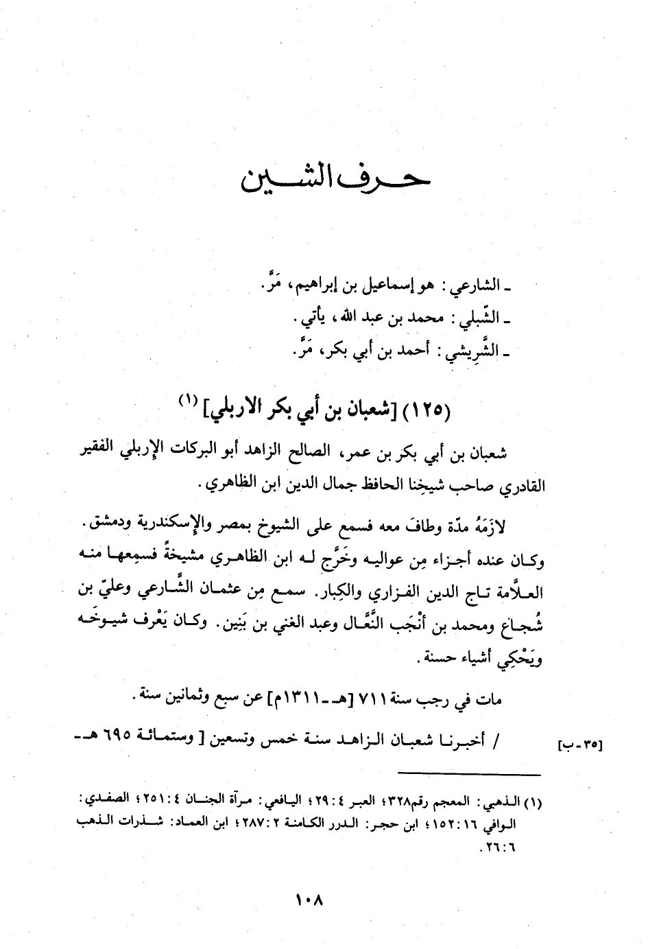 شَعْبَانُ بْنُ أَبِي بَكْرِ بْنِ عُمَرَ، الصَّالِحُ الزَّاهِدُ أَبُو الْبَرَكَاتِ الْأَرْبَلِيُّ الْفَقِيرُ الْقَادِرِيُّ صَاحِبُ شَيْخِنَا الْحَافِظِ جَمَالِ الدِّينِ ابْنِ الظَّاهِرِيِّ.