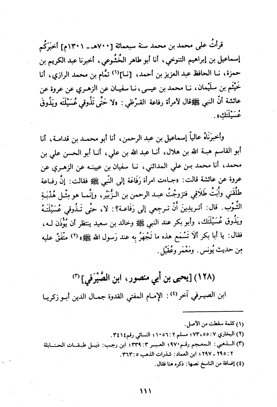 قَرَأْتُ عَلَى مُحَمَّدِ بْنِ مُحَمَّدٍ سَنَةَ سَبْعِ مِائَةٍ، أَخْبَرَكُمْ إِسْمَاعِيلُ بْنُ إِبْرَاهِيمَ التَّنُّوخِيُّ، أَنَا أَبُو طَاهِرٍ الْخُشُوعِيُّ، أَخْبَرَنَا عَبْدُ الْكَرِيمِ بْنُ حَمْزَةَ، نَا الْحَافِظُ عَبْدُ الْعَزِيزِ بْنُ أَحْمَدَ، نَا تَمَّامُ بْنُ مُحَمَّدٍ الرَّازِيُّ، أَنَا خُثَيْمُ بْنُ سُلَيْمَانَ، نَا مُحَمَّدُ بْنُ عِيسَى، نَا سُفْيَانُ، عَنِ الزُّهْرِيِّ، عَنْ عُرْوَةَ، عَنْ عَائِشَةَ، أَنّ النَّبِيَّ صَلَّى اللَّهُ عَلَيْهِ وَسَلَّمَ , قَالَ لِامْرَأَةِ رِفَاعَةَ الْقُرَظِيِّ: «لَا حَتَّى تَذُوقِي عُسَيْلَتَهُ وَيَذُوقَ عُسَيْلَتَكَ»