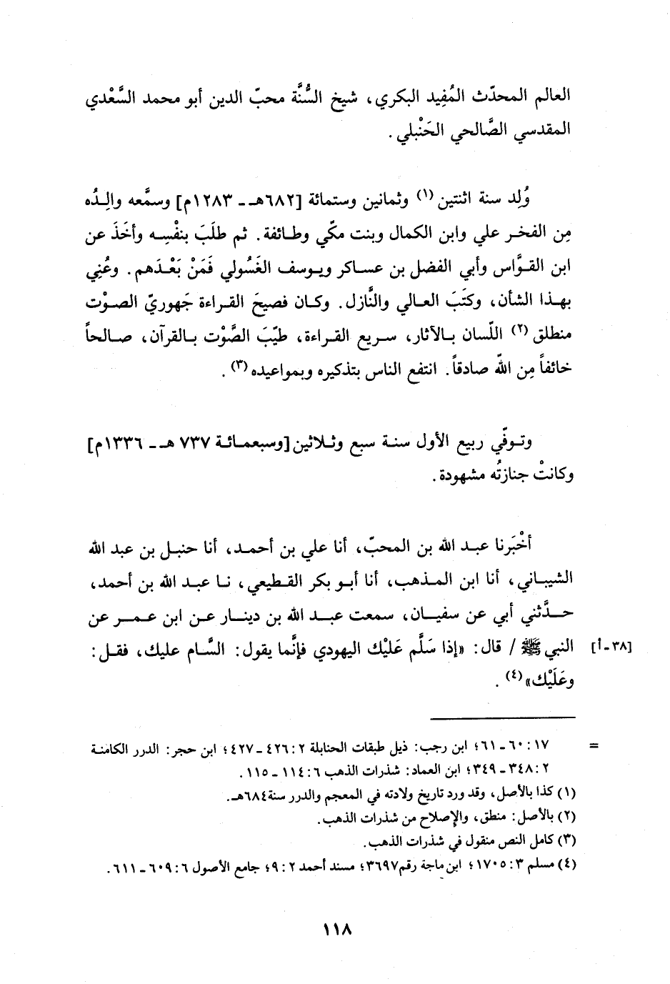 الْعَالِمُ الْمُحَدِّثُ الْمُفِيدُ الْبَكْرِيُّ، شَيْخُ السُّنَّةِ مُحِبُّ الدِّينِ أَبُو مُحَمَّدٍ السَّعْدِيُّ الْمَقْدِسِيُّ الصَّالِحِيُّ الْحَنْبَلِيُّ.