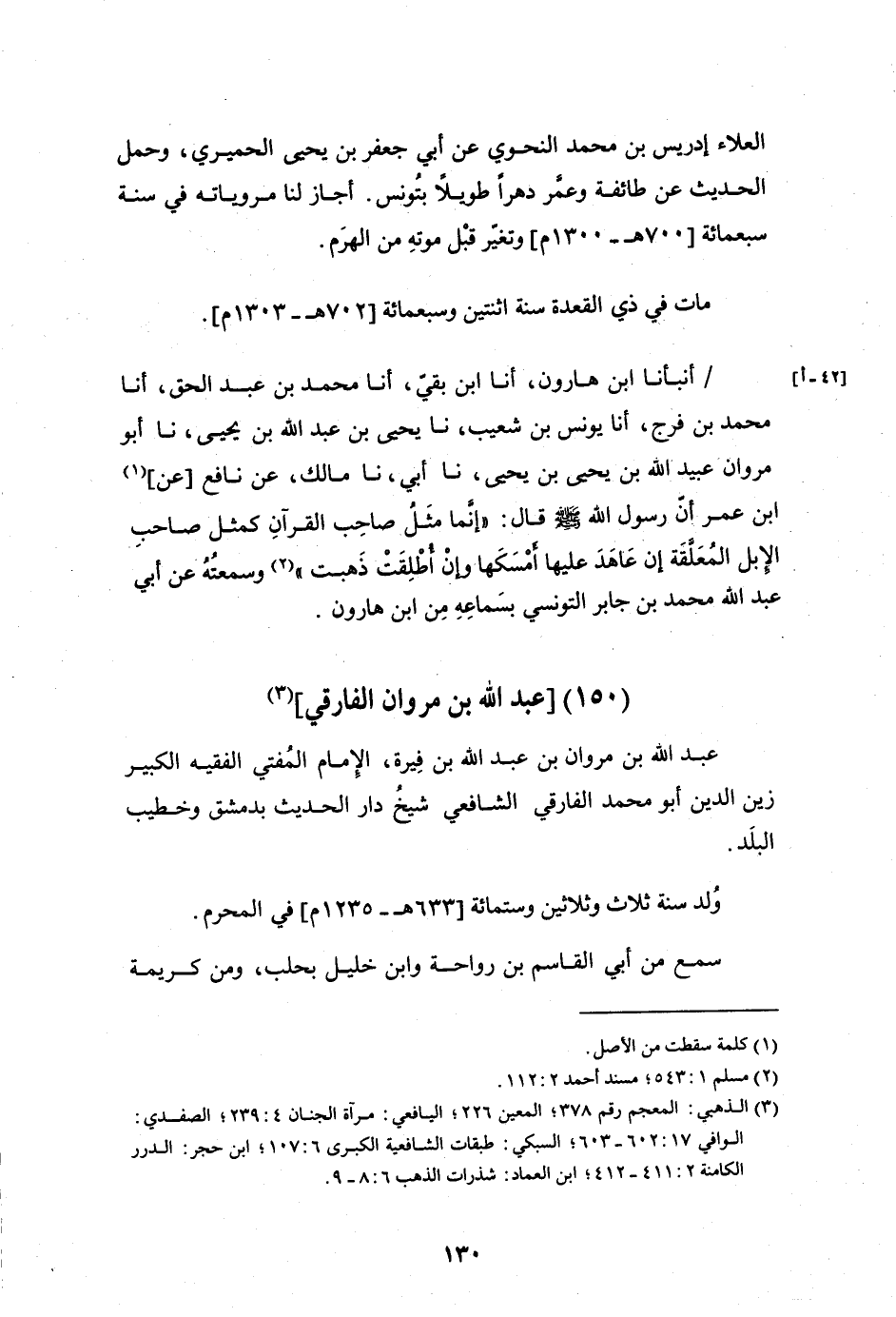 أَنْبَأَنَا ابْنُ هَارُونَ، أَنَا ابْنُ بَقِيٍّ، أَنَا مُحَمَّدُ بْنُ عَبْدِ الْحَقِّ، أَنَا مُحَمَّدُ بْنُ فَرَجٍ، أَنَا يُونُسَ بْنُ شُعَيْبٍ، نَا يَحْيَى بْنُ عَبْدِ اللَّهِ بْنِ يَحْيَى، نَا أَبُو مَرْوَانَ عُبَيْدُ اللَّهِ بْنُ يَحْيَى بْنُ يَحْيَى، نَا أَبِي، نَا مَالِكٌ، عَنْ نَافِعٍ، عَنِ ابْنِ عُمَرَ، أَنّ رَسُولَ اللَّهِ صَلَّى اللَّهُ عَلَيْهِ وَسَلَّمَ، قَالَ: إِنَّمَا مَثَلُ صَاحِبِ الْقُرْآنِ كَمَثَلِ صَاحِبِ الْإِبِلِ الْمُعْقَلَةِ إِنْ عَاهَدَ عَلَيْهَا أَمْسَكَهَا وَإِنْ أُطْلِقَتْ ذَهَبَتْ " وَسَمِعْتُهُ عَنْ أَبِي عَبْدِ اللَّهِ مُحَمَّدِ بْنِ جَابِرٍ التُّونِسِيُّ بِسَمَاعِهِ مِنِ ابْنِ هَارُونَ