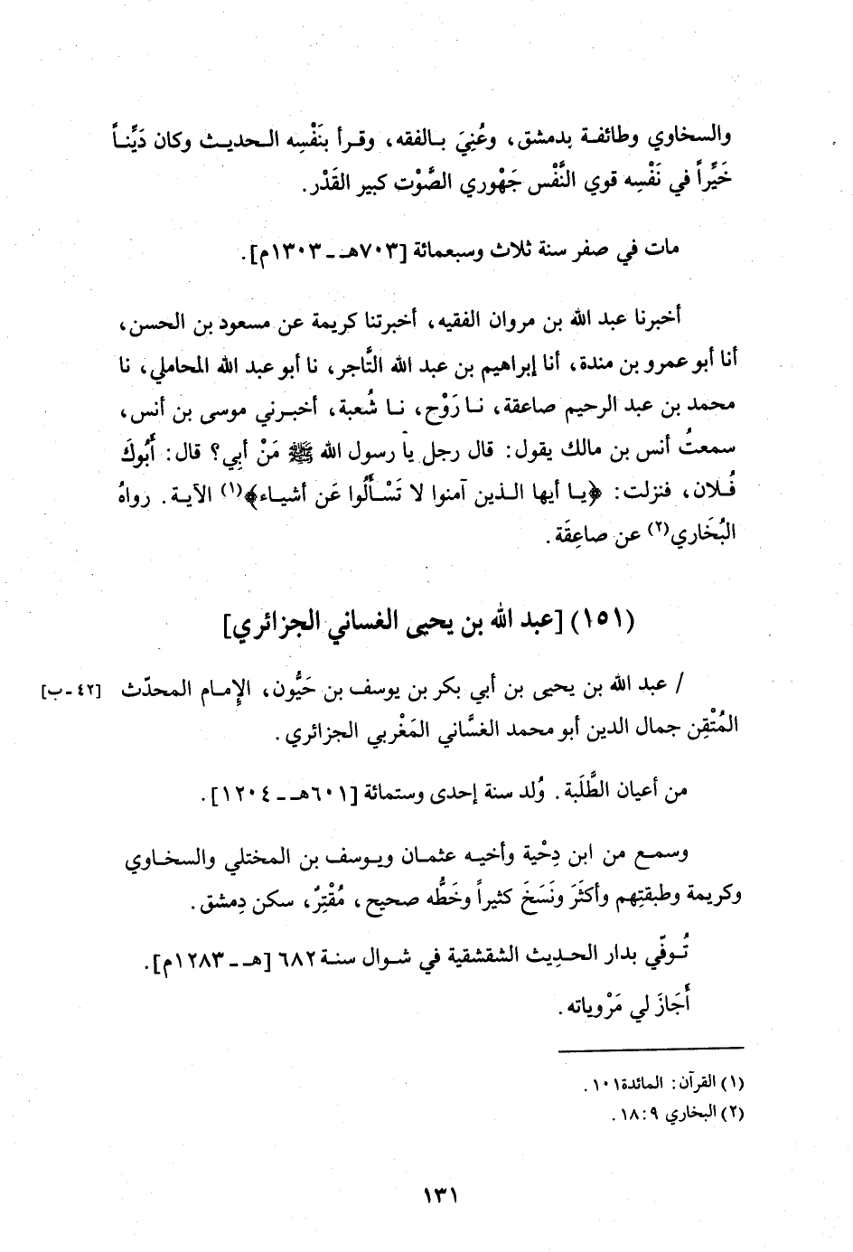 أَخْبَرَنَا عَبْدُ اللَّهِ بْنُ مَرْوَانَ الْفَقِيهُ، أَخْبَرَتْنَا كَرِيمَةُ، عَنْ مَسْعُودِ بْنِ الْحَسَنِ، أَنَا أَبُو عُمَرَ بْنِ مَنْدَهْ، أَنَا إِبَرَاهِيمُ بْنُ عَبْدِ الْقَادِرِ، نَا أَبُو عَبْدِ اللَّهِ الْحَامِلِيُّ، نَا مُحَمَّدُ بْنُ عَبْدِ الرَّحِيمِ صَاعِقَةٌ، نَا رَوْحٌ، نَا شُعْبَةُ، أَخْبَرَنِي مُوسَى بْنُ أَنَسٍ، سَمِعْتُ أَنَسَ بْنَ مَالِكٍ، يَقُولُ: قَالَ رَجُلٌ: يَا رَسُولَ اللَّهِ، مَنْ أَبِي؟ قَالَ: «أَبُوكَ فُلَانٌ» ، فَنَزَلَتْ: {يَأَيُّهَا الَّذِينَ آمَنُوا لَا تَسْأَلُوا عَنْ أَشْيَاءَ} [الْمَائِدَة: 101] " الْآيَةُ.