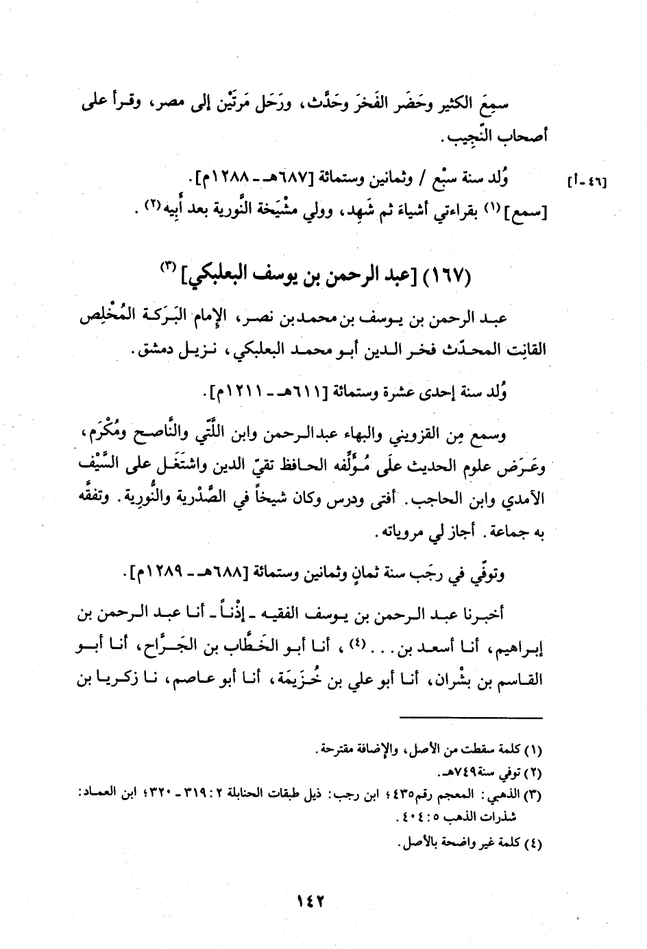 عَبْدُ الرَّحْمَنِ بْنُ يُوسُفَ بْنِ مُحَمَّدِ بْنِ نَصْرٍ، الْإِمَامُ الْبَرَكَةُ الْمُخْلِصُ الْقَانِتُ الْمُحَدِّثُ فَخْرُ الدِّينِ أَبُو مُحَمَّدٍ الْبَعْلَبَكِيُّ، نَزِيلُ دِمَشْقَ.