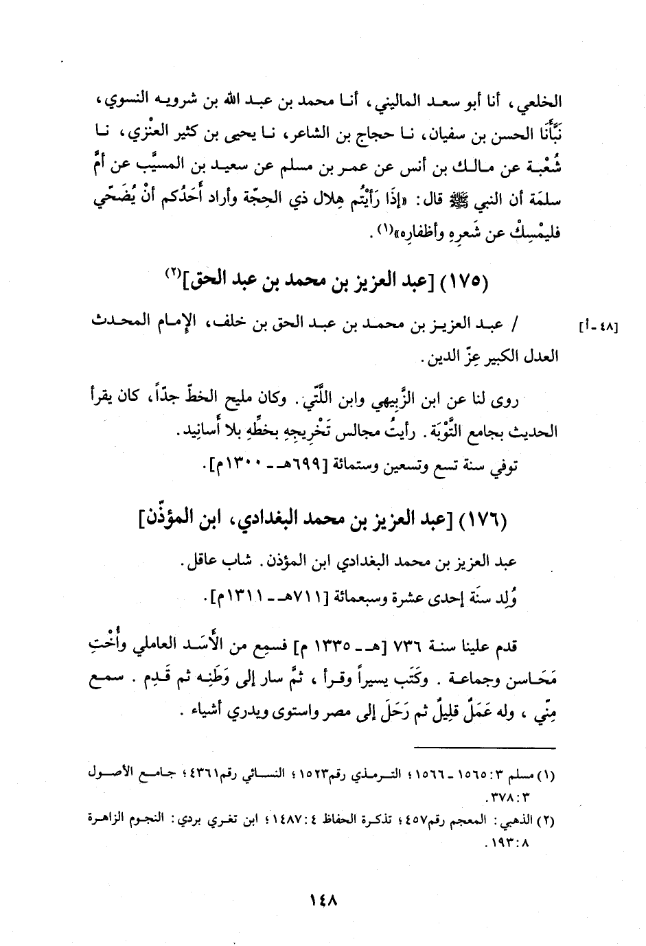 الْخِلَعِيُّ، نَا أَبُو سَعْدٍ الْمَالِينِيُّ، أَنَا مُحَمَّدُ بْنُ عَبْدِ اللَّهِ بْنِ شَرْوَيْهِ النَّسَوِيُّ، نَبَّأَنَا الْحَسَنُ بْنُ سُفْيَانَ، نَا حَجَّاجُ بْنُ الشَّاعِرِ، نَا يَحْيَى بْنُ كَثِيرٍ الْعَنَزِيُّ، نَا شُعْبَةُ، عَنْ مَالِكِ بْنِ أَنَسٍ، وَعُمَرُ بْنُ مُسْلِمٍ، عَنْ سَعِيدِ بْنِ الْمُسَيِّبِ، عَنْ أُمِّ سَلَمَةَ، أَنّ النَّبِيَّ صَلَّى اللَّهُ عَلَيْهِ وَسَلَّمَ، قَالَ: «إِذَا رَأَيْتُمُ هِلَالَ ذِي الْحَجَّةِ وَأَرَادَ أَحَدُكُمْ أَنْ يُضَحِّي فَلْيُمْسِكْ عَنْ شَعْرِهِ وَأَظْفَارِهِ»
