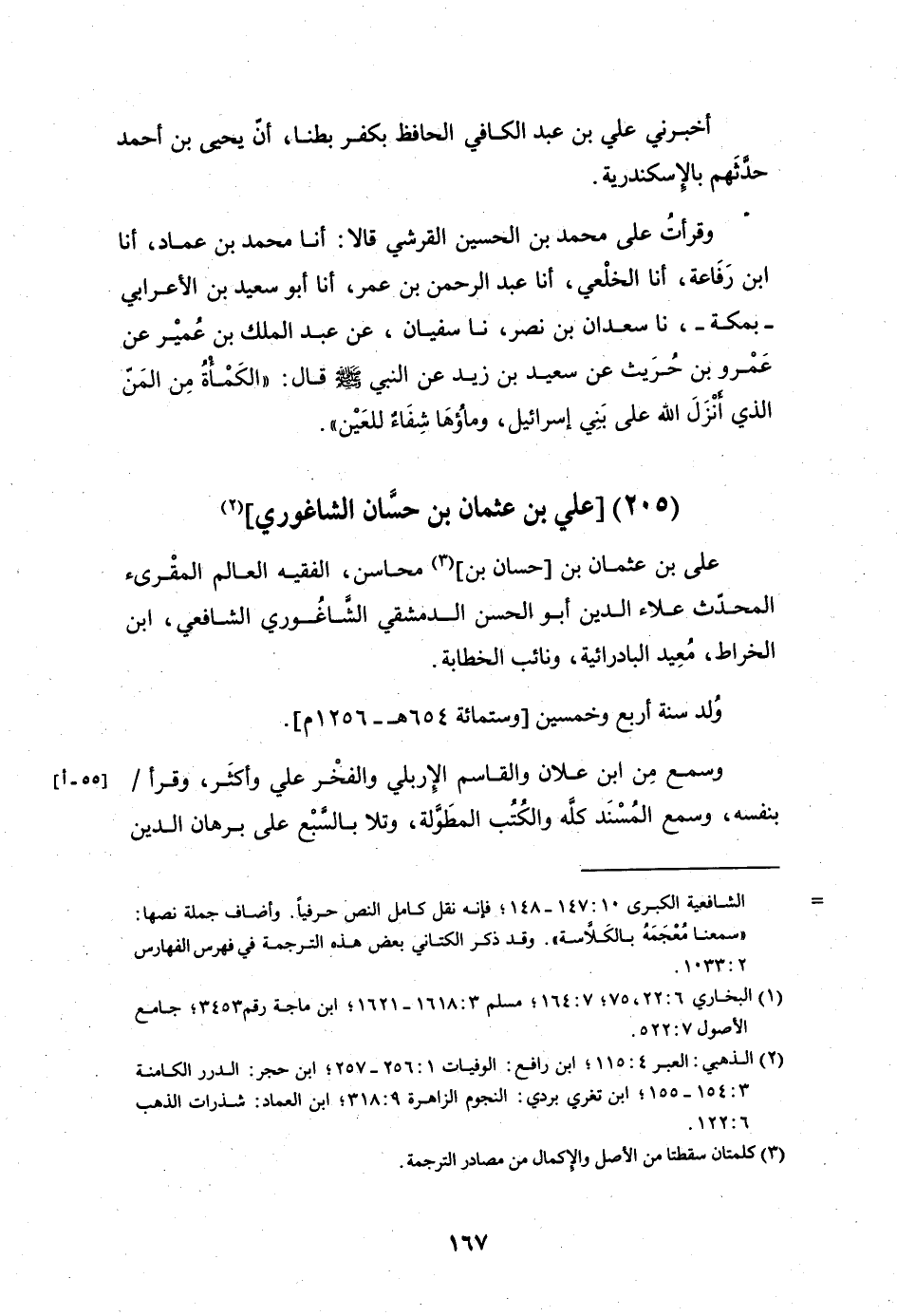 أَخْبَرَنِي عَلِيُّ بْنُ عَبْدِ الْكَافِي الْحَافِظُ بِكَفْرِ بَطَنَا، أَنَّ يَحْيَى بْنَ أَحْمَدَ حَدَّثَهُمْ بِالْإِسْكَنْدَرِيَّةِ، وَقَرَأْتُ عَلَى مُحَمَّدِ بْنِ الْحُسَيْنِ الْقُرَشِيِّ، قَالَا: أَنَا مُحَمَّدُ بْنُ عِمَادٍ، أَنَا ابْنُ رِفَاعَةَ، أَنَا الْخِلَعِيِّ، أَنَا عَبْدُ الرَّحْمَنِ بْنُ عُمَرَ، أَنَا أَبُو سَعِيدِ بْنِ الْأَعْرَابِيِّ , بِمَكَّةَ، نَا سَعْدَانُ بْنُ نَصْرٍ، نَا سُفْيَانُ، عَنْ عَبْدِ الْمَلِكِ بْنِ عُمَيْرٍ، عَنْ عَمْرِو بْنِ حُرَيْثٍ، عَنْ سَعِيدِ بْنِ زَيْدٍ، عَنِ النَّبِيِّ صَلَّى اللَّهُ عَلَيْهِ وَسَلَّمَ، قَالَ: «الْكَمْأَةُ مِنَ الْمَنِّ الَّذِي أَنْزَلَ اللَّهُ عَلَى بَنِي إِسْرَائِيلَ، وَمَاؤُهَا شِفَاءٌ لِلْعَيْنِ»