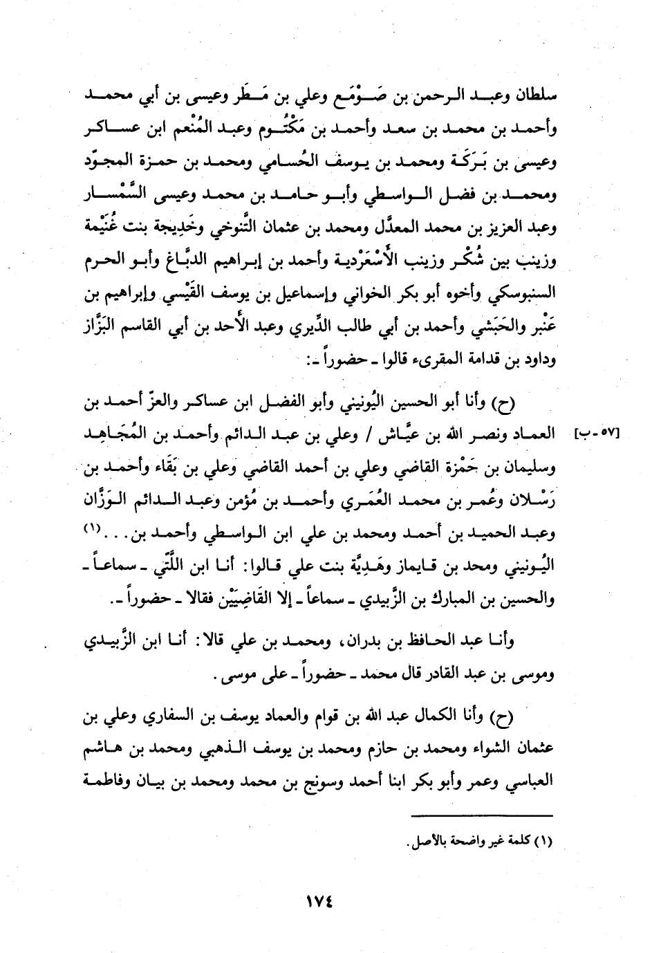سُلْطَانَةَ، وَعَبْدُ الرَّحْمَنِ بْنُ صَوْمَعٍ، وَعَلِيُّ بْنُ مَطَرٍ، وَعِيسَى بْنُ أَبِي مُحَمَّدٍ، وَأَحْمَدُ بْنُ مُحَمَّدِ بْنِ سَعْدٍ، وَأَحْمَدُ بْنُ مَكْتُومٍ، وَعَبْدُ الْمُنْعِمِ ابْنُ عَسَاكِرَ، وَعِيسَى بْنُ بَرَكَةَ، وَمُحَمَّدُ بْنُ يُوسُفَ الْحُسَامِيُّ، وَمُحَمَّدُ بْنُ حَمْزَةَ الْمُجَرَّدِ، وَمُحَمَّدُ بْنُ فَضْلٍ الْوَاسِطِيُّ، وَأَبُو حَامِدِ بْنِ مُحَمَّدٍ، وَعِيسَى السِّمْسَارُ، وَعَبْدُ الْعَزِيزِ بْنُ مُحَمَّدٍ الْمُعَدِّلِ، وَمُحَمَّدُ بْنُ عُثْمَانَ التَّنُّوخِيُّ، وَخَدِيجَةُ بِنْتُ غُنَيْمَةَ، وَزَيْنَبُ بِنْتُ شُكْرٍ، وَزَيْنَبُ الْأَسْعَرْدِيَّةُ، وَأَحْمَدُ بْنُ إِبْرَاهِيمَ الدَّبَّاغُ، وَأَبُو الْحَرَمِ السَّنْبُوسَكِيُّ، وَأَخُوهُ أَبُو بَكْرٍ الْخَوَانِيُّ، وَإِسْمَاعِيلُ بْنُ يُوسُفَ الْقَيْسِيُّ، وَإِبْرَاهِيمُ بْنُ عَنْبَرٍ، وَالْحَبَشِيُّ، وَأَحْمَدُ بْنُ أَبِي طَالِبٍ الدِّيرِيُّ، وَعَبْدُ الْأَحَدِ بْنُ أَبِي الْقَاسِمِ الْبَزَّازُ، وَدَاوُدُ بْنُ قُدَامَةَ الْمُقْرِئُ، قَالُوا حُضُورًا: وَأَنَا أَبُو الْحُسَيْنِ الْيُونِينِيُّ، وَأَبُو الْفَضْلِ ابْنُ عَسَاكِرَ، وَالْعِزُّ أَحْمَدُ بْنُ الْعِمَادِ، وَنَصْرُ اللَّهِ بْنُ عَيَّاشٍ، وَعَلِيُّ بْنُ عَبْدِ الدَّائِمِ، وَأَحْمَدُ بْنُ الْمُجَاهِدِ، وَسُلَيْمَانُ بْنُ حَمْزَةَ الْقَاضِي، وَعَلِيُّ بْنُ أَحْمَدَ الْقَاضِي، وَعَلِيُّ بْنُ بَقَاءٍ، وَأَحْمَدُ بْنُ رَسْلَانَ، وَعُمَرُ بْنُ مُحَمَّدٍ الْعُمَرِيُّ، وَأَحْمَدُ بْنُ مُؤْمِنٍ، وَعَبْدُ الدَّائِمِ الْوَزَّانُ، وَعَبْدُ الْحَمِيدِ بْنُ أَحْمَدَ، وَمُحَمَّدُ بْنُ عَلِيِّ ابْنِ الْوَاسِطِيُّ، وَأَحْمَدُ بْنُ. . . . الْيُونِينِيُّ، وَمُحَمَّدُ بْنُ قَايِمَازَ، وَهَدِيَّةُ بِنْتُ عَلِيٍّ، قَالُوا: أَنَا ابْنُ اللَّتِّيُّ سَمَاعًا، وَالْحُسَيْنُ بْنُ الْمُبَارَكِ بْنُ الزُّبَيْدِيُّ سَمَاعًا إِلَّا الْقَاضِيَيْنِ، فَقَالَا حُضُورًا: وَأَنَا عَبْدُ الْحَافِظِ بْنُ بَدْرَانَ، وَمُحَمَّدُ بْنُ عَلِيٍّ، قَالَا: أَنَا ابْنُ الزُّبَيْدِيُّ، وَمُوسَى بْنُ عَبْدِ الْقَادِرِ، قَالَ مُحَمَّدٌ: حُضُورًا َعَلَى مُوسَى، وَأَنَا الْكَمَالُ عَبْدُ اللَّهِ بْنُ قَوَّامٍ، وَالْعِمَادُ يُوسُفُ بْنُ السِّفَارِيِّ، وَعَلِيُّ بْنُ عُثْمَانَ الشَّوَّاءُ، وَمُحَمَّدُ بْنُ حَازِمٍ، وَمُحَمَّدُ بْنُ يُوسُفَ الذَّهَبِيُّ، وَمُحَمَّدُ بْنُ هَاشِمٍ الْعَبَّاسِيُّ، وَعُمَرُ، وَأَبُو بَكْرٍ , ابْنَا أَحْمَدَ، وَسَوْنَجُ بْنُ مُحَمَّدٍ، وَمُحَمَّدُ بْنُ بَيَانٍ، وَفَاطِمَةُ