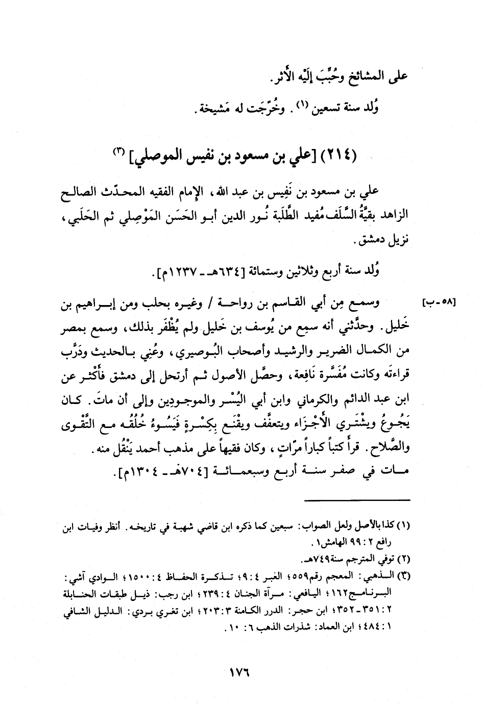 عَلِيَّ بْنُ مَسْعُودِ بْنِ نَفِيسِ بْنِ عَبْدِ اللَّهِ، الْإِمَامُ الْفَقِيهُ الْمُحَدِّثُ الصَّالِحُ الزَّاهِدُ بَقِيَّةُ السَّلَفِ مُفِيدُ الطَّلَبَةِ نُورُ الدِّينِ أَبُو الْحَسَنِ الْمَوْصِلِيُّ ثُمَّ الْحَلَبِيُّ، نَزِيلُ دِمَشْقَ.
