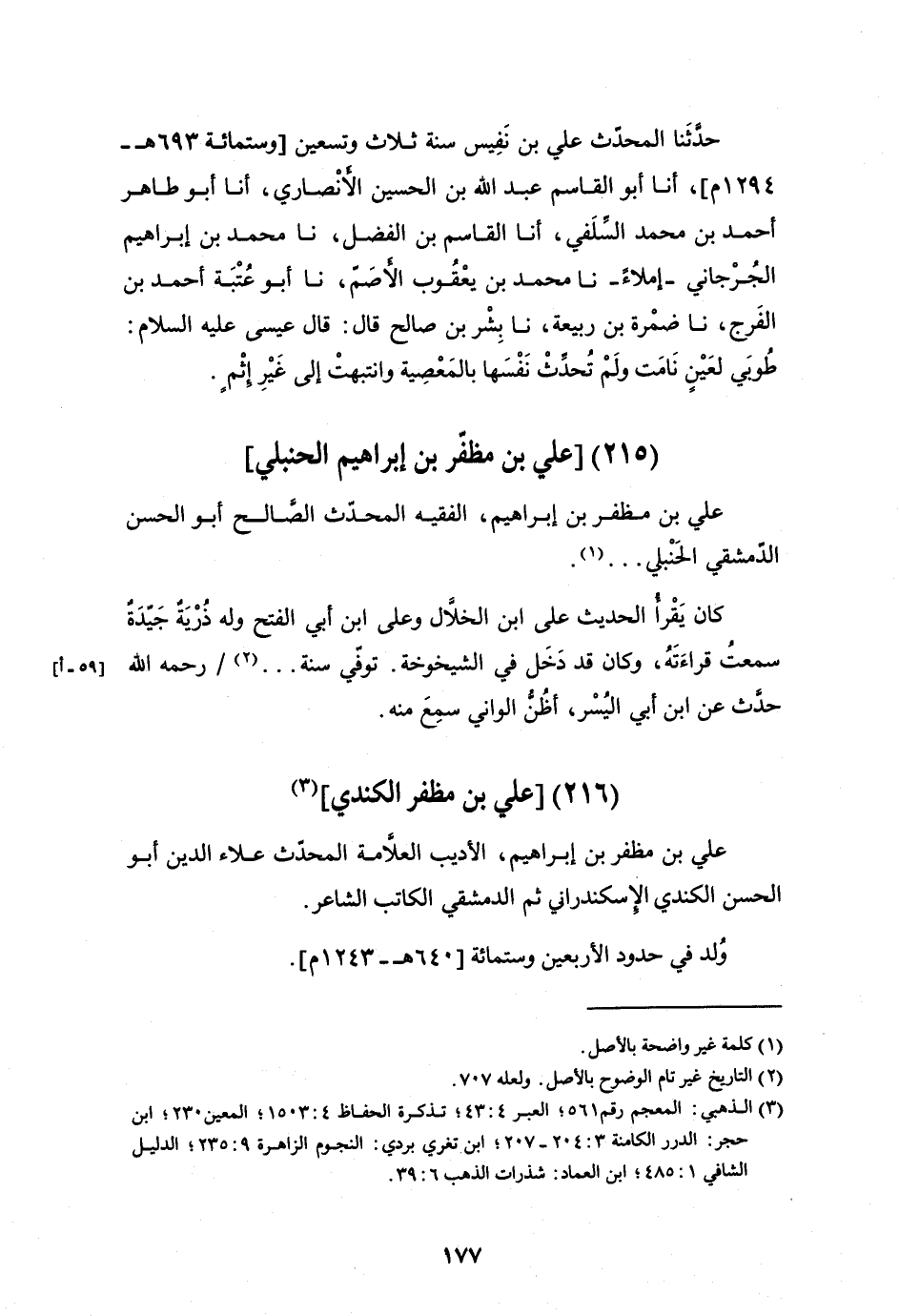 عَلِيُّ بْنُ مُظَفَّرٍ بْنِ إِبْرَاهِيمَ، الْفَقِيهُ الْمُحَدِّثُ الصَّالِحُ أَبُو الْحَسَنِ الدِّمَشْقِيُّ الْحَنْبَلِيُّ. . . . . . . . كَانَ يَقْرَأُ الْحَدِيثَ عَلَى ابْنِ الْخَلَّالِ , وَعَلَى ابْنِ أَبِي الْفَتْحِ وَلَهُ ذُرِّيَّةٌ جَيِّدَةٌ سَمِعْتُ قِرَاءَتَهُ، وَكَانَ قَدْ دَخَلَ فِي الشَّيْخُوخَةِ.