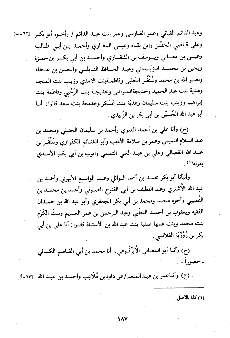 وَعَبْدُ الدَّائِمِ الْقَبَّانِيُّ، وَعُمَرُ الْفَارِسِيُّ، وَعُمَرُ بْنُ عَبْدِ الدَّائِمِ، وَأَخُوهُ أَبُو بَكْرٍ، وَعَلِيٌّ قَاضِي الْحِصْنُ، وَابْنُ بَقَاءٍ، وَعِيسَى الْمَغَارِيُّ، وَأَحْمَدُ بْنُ أَبِي طَالِبٍ، وَعِيسَى بْنُ مَعَالِي، وَيُوسُفُ بْنُ الشَّقَّارِيُّ، وَأَحْمَدُ بْنُ أَبِي بَكْرِ بْنِ حَمْزَةَ، وَيَحْيَى بْنِ مُحَمَّدٍ الزَّبَدَانِيُّ، وَعَبْدُ الْحَافِظِ النَّابُلْسِيُّ، وَالْحَسَنُ بْنُ عَطَاءٍ، وَنَصْرُ اللَّهِ بْنُ مُحَمَّدٍ، وَسُنْقُرٌ الْحَلَبِيُّ، وَفَاطِمَةُ بِنْتُ الْآمِدِيُّ، وَزَيْنَبُ بِنْتُ الْمُنَجَّا، وَهَدِيَّةُ بِنْتُ عَبْدِ الْحَمِيدِ، وَخَدِيجَةُ الْمَرَاتِبِيُّ، وَخَدِيجَةُ بِنْتُ الرَّهَبِيُّ، وَفَاطِمَةُ بِنْتُ إِبْرَاهِيمَ، وَزَيْنَبُ بِنْتُ سُلَيْمَانَ، وَهَدِيَّةُ بِنْتُ عَسْكَرٍ، وَخَدِيجَةُ بِنْتُ سَعْدٍ، قَالُوا: أَنَا أَبُو عَبْدِ اللَّهِ الْحُسَيْنُ بْنُ أَبِي بَكْرِ بْنِ الزُّبَيْدِيُّ، وَأَنَا عَلِيُّ بْنُ أَحْمَدَ الْعَلَوِيُّ، وَأَحْمَدُ بْنُ سُلَيْمَانَ الْحَنْبَلِيُّ، وَمُحَمَّدُ بْنُ عَبْدِ السَّلَامِ التَّمِيمِيُّ، وَعُمَرُ بْنُ سَلَامَةَ الْأَدِيبُ، وَأَبُو الْغَنَائِمِ الْكَفْرَاوِيُّ، وَسُنْقُرُ بْنُ عَبْدِ اللَّهِ الْقَضَائِيُّ، وَعَلِيُّ بْنُ عَبْدِ الْغَنِيِّ التَّمِيمِيُّ، وَأَيُّوبُ بْنُ أَبِي بَكْرٍ الْأَسَدِيُّ بِقَوْلِهِ: وَأَنْبَأَنَا أَبُو بَكْرٍ مُحَمَّدُ بْنُ أَحْمَدَ الْوَائِلِيُّ، وَعَبْدُ الْوَاسِعِ الْأَبْهَرِيُّ، وَأَحْمَدُ بْنُ عَبْدِ اللَّهِ الْأَشْتَرِيُّ، وَعَبْدُ اللَّطِيفِ بْنِ أَبِي الْفُتُوحِ الصُّوفِيُّ، وَأَحْمَدُ بْنُ مُحَمَّدِ بْنِ النَّصِيبِيِّ، وَأَخُوهُ مُحَمَّدٌ، وَمُحَمَّدُ بْنُ أَبِي بَكْرٍ الْجَعْفَرِيُّ، وَأَبُو عَبْدِ اللَّهِ بْنِ حَمْدَانَ الْفَقِيهُ، وَيَعْقُوبُ بْنُ أَحْمَدَ الْحَلَبِيُّ، وَعَبْدُ الرَّحْمَنِ بْنُ عُمَرَ الْعَدِيمُ، وَسِتُّ الْكَرَمِ بِنْتُ مُحَمَّدٍ، وَبِنْتُ عَمِّهَا صَفِيَّةُ بِنْتُ عَبْدِ اللَّهِ بْنِ الْأُسْتَاذِ، قَالُوا: أَنَا عَلِيُّ بْنُ أَبِي بَكْرِ بْنِ رَوْزَبَةَ الْقَلَانِسِيُّ، وَأَنَا أَبُو الْمَعَالِي الْأَبْرَقُوهِيُّ، أَنَا مُحَمَّدُ بْنُ أَبِي الْقَاسِمِ الْكِسَائِيُّ حُضُورًا، وَأَنَا عُمَرُ بْنُ عَبْدِ الْمُنْعِمِ، عَنْ دَاوُدَ بْنِ مُلَاعِبٍ، وَأَحْمَدُ بْنُ عَبْدِ اللَّهِ