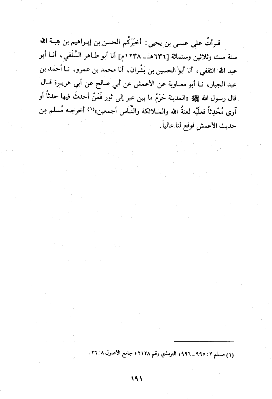 قَرَأْتُ عَلَى عِيسَى بْنِ يَحْيَى: أَخْبَرَكُمُ الْحَسَنُ بْنُ إِبْرَاهِيمَ بْنِ هِبَةِ اللَّهِ سَنَةَ سِتٍّ وَثَلَاثِينَ وَسِتِّ مِائَةٍ، أَنَا أَبُو طَاهِرٍ السِّلَفِيُّ، أَنَا أَبُو عَبْدِ اللَّهِ الثَّقَفِيُّ، أَنَا أَبُو الْحُسَيْنِ بْنُ بِشْرَانِ، أَنَا مُحَمَّدُ بْنُ عَمْرٍو، نَا أَحْمَدُ بْنُ عَبْدِ الْجَبَّارِ، نَا أَبُو مُعَاوِيَةَ، عَنِ الْأَعْمَشِ، عَنِ أَبِي صَالِحٍ، عَنْ أَبِي هُرَيْرَةَ، قَالَ: قَالَ رَسُولُ اللَّهِ صَلَّى اللَّهُ عَلَيْهِ وَسَلَّمَ: «الْمَدِينَةُ حَرَمٌ مَا بَيْنَ عَيرٍ إِلَى ثَوْرٍ فَمَنْ أَحْدَثَ فِيهَا حَدَثًا أَوْ آوَى مُحْدِثًا فَعَلَيْهِ لَعْنَةُ اللَّهِ وَالْمَلَائِكَةِ وَالنَّاسِ أَجْمَعِينَ» .