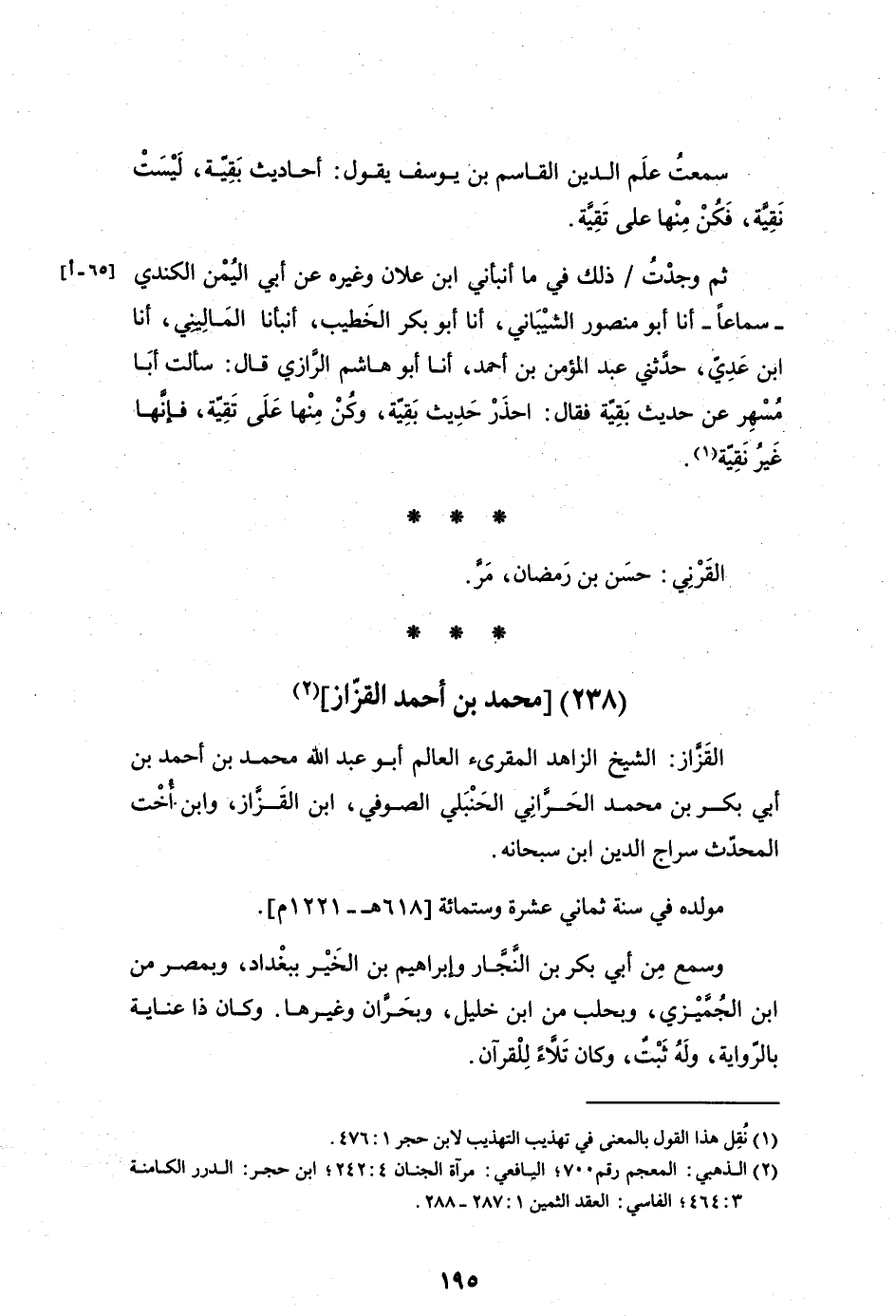 الْقَرْنِيُّ: حَسَنُ بْنُ رَمَضَانَ، مَرَّ الْقَزَّازُ: الشَّيْخُ الزَّاهِدُ الْمُقْرِئُ الْعَالِمُ أَبُو عَبْدِ اللَّهِ مُحَمَّدُ بْنُ أَحْمَدَ بْنِ أَبِي بَكْرِ بْنِ مُحَمَّدٍ الْحَرَّانِيُّ الْحَنْبَلِيُّ الصُّوفِيُّ، ابْنُ الْقَزَّازِ، وَابْنُ أُخْتِ الْمُحَدِّثِ سِرَاجِ الدِّينِ ابْنِ سَبْحَانَةَ.