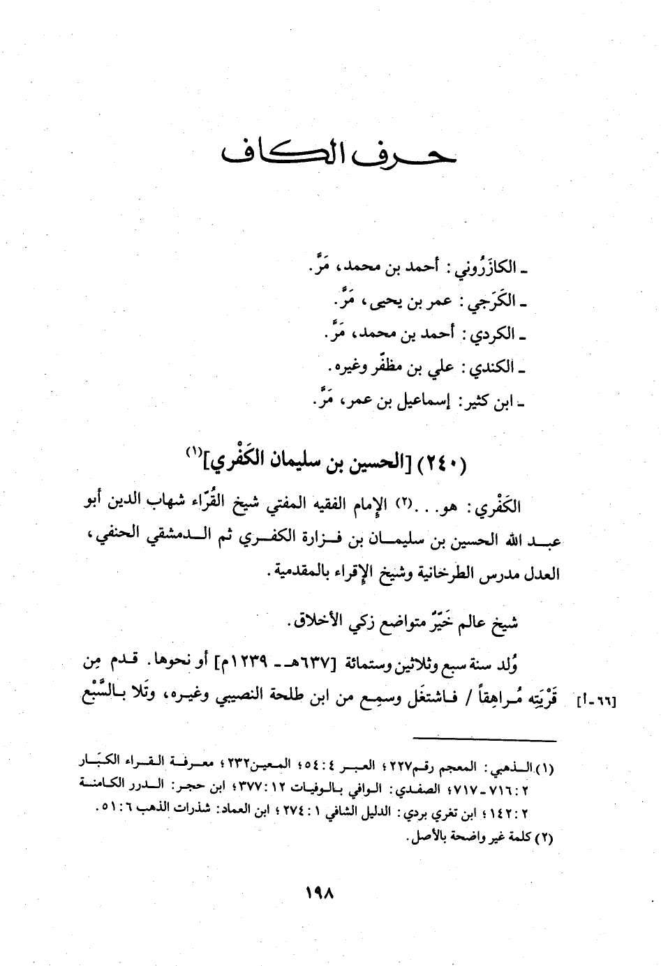 ابْنُ كَثِيرٍ: إِسْمَاعِيلُ بْنُ عُمَرَ، مَرَّ الْكَفْرِيُّ: هُوَ. . . . . . الْإِمَامُ الْفَقِيهُ الْمُفْتِي شَيْخُ الْقُرَّاءِ شِهَابُ الدِّينِ أَبُو عَبْدِ اللَّهِ الْحُسَيْنُ بْنُ سُلَيْمَانَ بْنِ فَزَارَةَ الْكَفْرِيُّ ثُمَّ الدِّمَشْقِيُّ الْحَنَفِيُّ، الْعَدْلُ مُدَرِّسُ الطَّرْخَانِيَّةَ وَشَيْخُ الْقُرَّاءِ بِالْمُقَدَّمِيَّةِ.