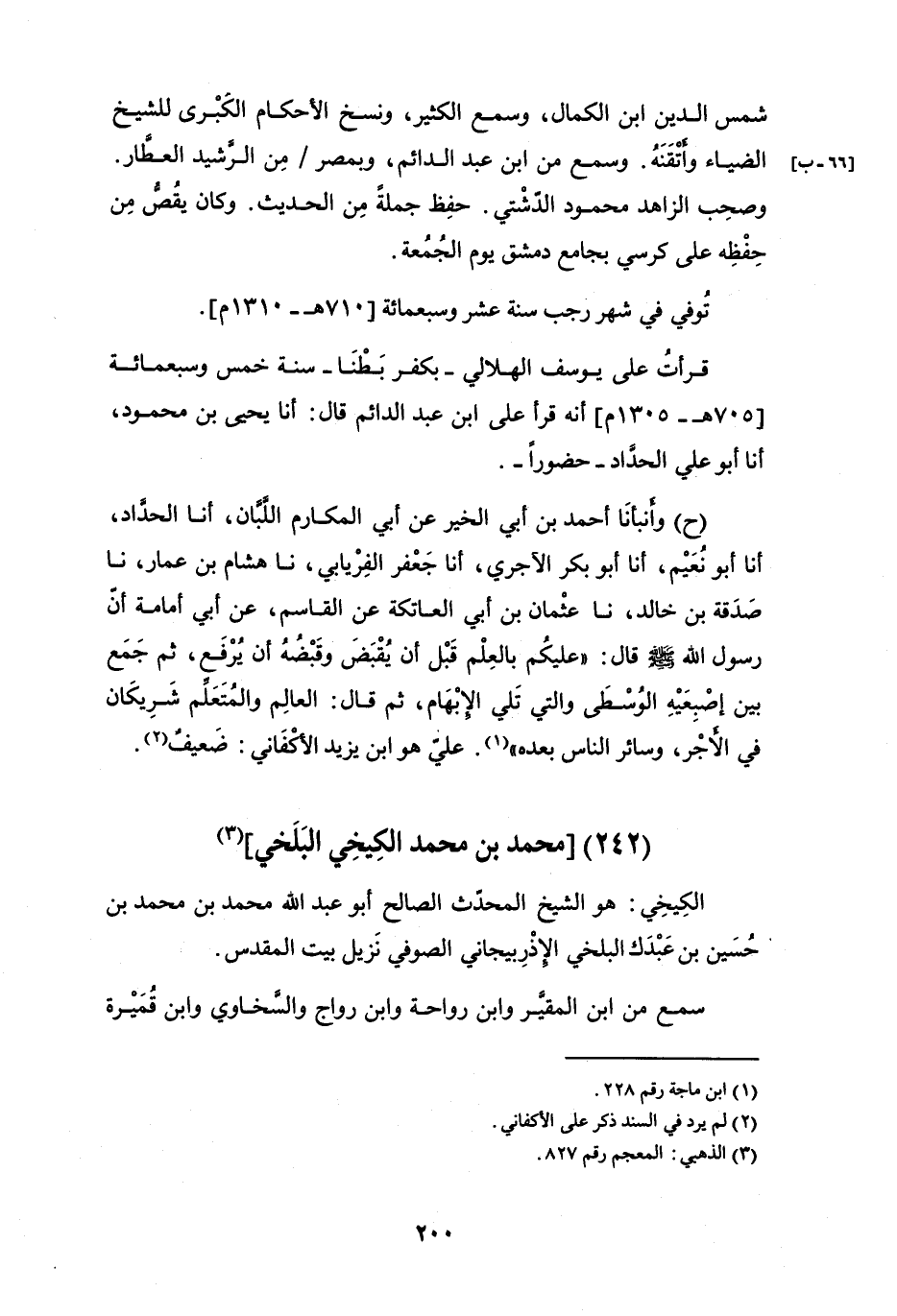 قَرَأْتُ عَلَى يُوسُفَ الْهِلَالِيِّ، بِكَفْرِ بَطَنَا سَنَةَ خَمْسٍ وَسَبْعِ مِائَةٍ، أَنَّهُ قَرَأَ عَلَى ابْنِ عَبْدِ الدَّائِمِ , قَالَ: أَنَا يَحْيَى بْنُ مَحْمُودٍ، أَنَا أَبُو عَلِيٍّ الْحَدَّادُ حُضُورًا، وَأَنْبَأَنَا أَحْمَدُ بْنُ أَبِي الْخَيْرِ، عَنْ أَبِي الْمَكَارِمِ اللَّبَّانِ، أَنَا الْحَدَّادُ، أَنَا أَبُو نُعَيْمٍ، أَنَا أَبُو بَكْرٍ الْآجُرِيُّ، أَنَا جَعْفَرُ الْفِرْيَابِيُّ، نَا هِشَامُ بْنُ عَمَّارٍ، نَا صَدَقَةُ بْنُ خَالِدٍ، نَا عُثْمَانُ بْنُ أَبِي الْعَاتِكَةِ، عَنِ الْقَاسِمِ، عَنْ أَبِي أُمَامَةَ، أَنَّ رَسُولَ اللَّهِ صَلَّى اللَّهُ عَلَيْهِ وَسَلَّم، قَالَ: «عَلَيْكُمْ بِالْعِلْمِ قَبْلَ أَنْ يُقْبَضَ وَقَبْضُهُ أَنْ يُرْفَعَ» ، ثُمَّ جَمَعَ بَيْنَ إِصْبَعَيْهِ الْوُسْطَى وَالَّتِي تَلِي الْإِبْهَامَ، ثُمَّ قَالَ: «الْعَالِمُ وَالْمُتَعَلِّمُ شَرِيكَانِ فِي الْأَجْرِ , وَسَائِرُ النَّاسِ بَعْدَهُ» عَلِيُّ هُوَ ابْنُ يَزِيدَ الْأَكْفَانِيُّ: ضَعِيفٌ