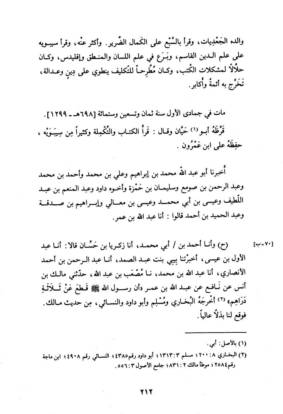 أَخْبَرَنَا أَبُو عَبْدِ اللَّهِ مُحَمَّدُ بْنُ إِبْرَاهِيمَ، وَعَلِيُّ بْنُ مُحَمَّدٍ، وَأَحْمَدُ بْنُ مُحَمَّدٍ، وَعَبْدُ الرَّحْمَنِ بْنُ صَوْمَعٍ، وَسُلَيْمَانُ بْنُ حَمْزَةَ، وَأَخُوهُ دَاوُدَ، وَعَبْدُ الْمُنْعِمِ بْنُ عَبْدِ اللَّطِيفِ، وَعِيسَى بْنُ أَبِي مُحَمَّدٍ، وَعِيسَى بْنُ مَعَالِي، وَإِبْرَاهِيمُ بْنُ صَدَقَةَ، وَعَبْدُ الْحَمِيدِ بْنُ أَحْمَدَ، قَالُوا: أَنَا عَبْدُ اللَّهِ بْنُ عُمَرَ، وَأَنَا أَحْمَدُ بْنُ أَبِي مُحَمَّدٍ، أَنَا زَكَرِيَّا بْنُ حَسَّانَ، قَالَا: أَنَا عَبْدُ الْأَوَّلِ بْنُ عِيسَى، أَخْبَرَتْنَا بَيْبِيُّ بْنُ عَبْدِ الصَّمَدِ، أَنَا عَبْدُ الرَّحْمَنِ بْنُ أَحْمَدَ الأَنْصَارِيُّ، أَنَا عَبْدُ اللَّهِ بْنُ مُحَمَّدٍ، نَا مُصْعَبُ بْنُ عَبْدِ اللَّهِ، حَدَّثَنِي مَالِكُ بْنُ أَنَسٍ، عَنْ نَافِعٍ، عَنْ عَبْدِ اللَّهِ بْنِ عُمَرَ، أَنّ رَسُولَ اللَّهِ صَلَّى اللَّهُ عَلَيْهِ وَسَلَّم: «قَطَعَ عَنْ ثَلَاثَةِ دَرَاهِمَ» أَخْرَجَهُ الْبُخَارِيُّ , وَمُسْلِمٌ , وَأَبُو دَاوُدَ , وَالنَّسَائِيُّ، مِنْ حَدِيثِ مَالِكٍ.
