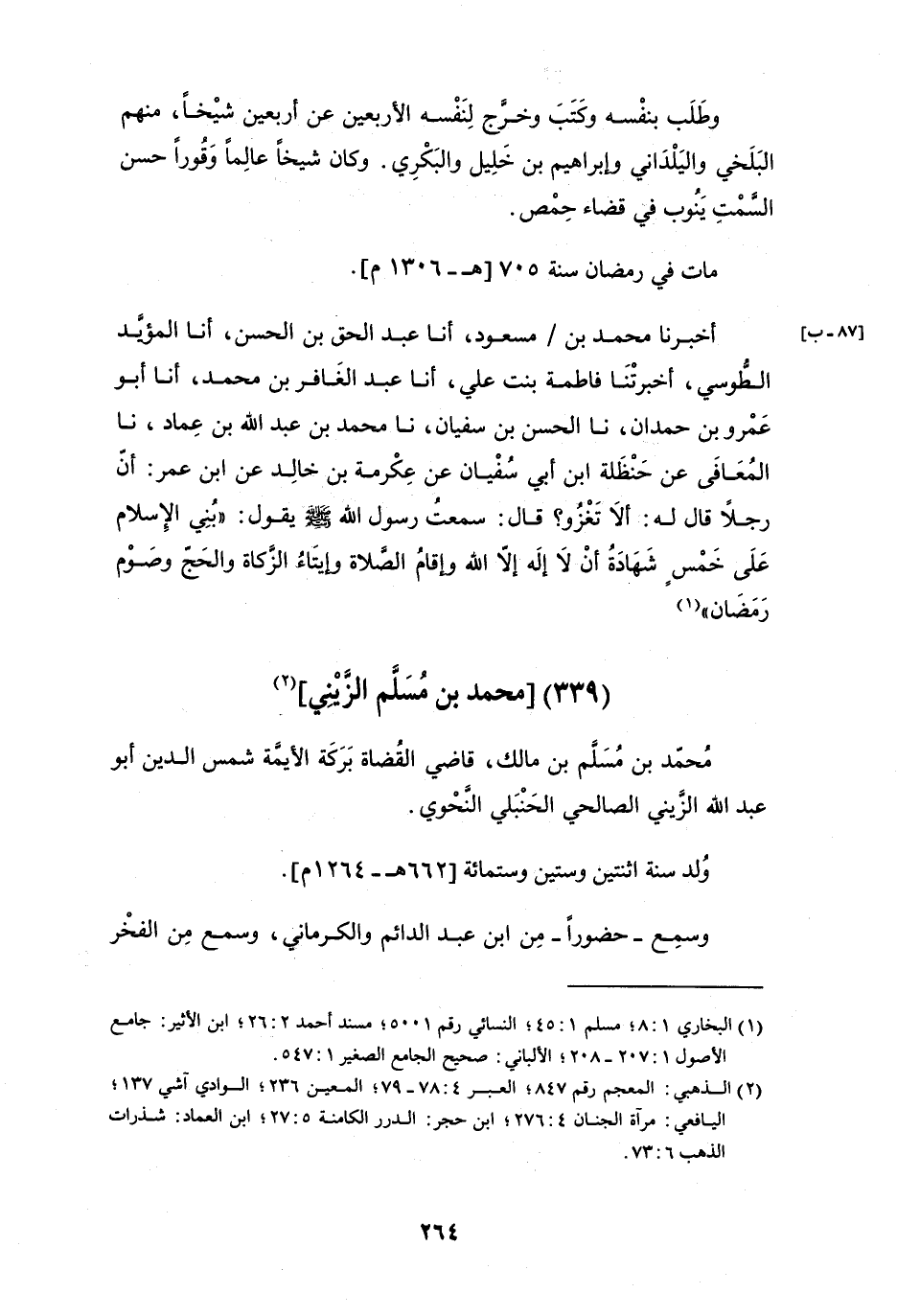 أَخْبَرَنَا مُحَمَّدُ بْنُ مَسْعُودٍ، أَنَا عَبْدُ الْحَقِّ بْنُ الْحَسَنِ، أَنَا الْمُؤَيَّدُ الطَّوْسِيُّ، أَخْبَرَتْنَا فَاطِمَةُ بِنْتُ عَلِيٍّ، أَنَا عَبْدُ الْغَافِرِ بْنُ مُحَمَّدٍ، أَنَا أَبُو عَمْرِو بْنِ حِمْدَانَ، نَا الْحَسَنُ بْنُ سُفْيَانَ، نَا مُحَمَّدُ بْنُ عَبْدِ اللَّهِ بْنِ عِمَادٍ، نَا الْمُعَافَى، عَنْ حَنْظَلَةَ ابْنِ أَبِي سُفْيَانَ، عَنْ عِكْرِمَةَ بْنِ خَالِدٍ، عَنِ ابْنِ عُمَرَ أَنَّ رَجُلًا قَالَ لَهُ: أَلا تَغْزُو؟ قَالَ: سَمِعْتُ رَسُولَ اللَّهِ صَلَّى اللَّهُ عَلَيْهِ وَسَلَّم، يَقُولُ: " بُنِيَ الإِسْلامُ عَلَى خَمْسٍ: شَهَادَةِ أَنْ لَا إِلَه إِلا اللَّهُ، وَإِقَامِ الصَّلاةِ، وَإِيتَاءِ الزَّكَاةِ، وَالْحَجِّ، وَصَوْمِ رَمَضَانَ "