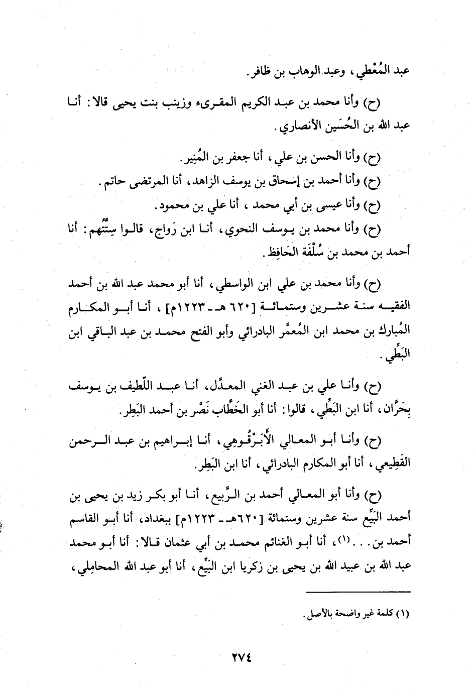 عَبْدِ الْمُعْطِي، وَعَبْدُ الْوَهَّابِ بْنُ ظَافِرٍ، وَأَنَا مُحَمَّدُ بْنُ عَبْدِ الْكَرِيمِ الْمُقْرِئُ، وَزَيْنَبُ بِنْتُ يَحْيَى , قَالا: أَنَا عَبْدُ اللَّهِ بْنُ الْحُسَيْنِ الأَنْصَارِيُّ، وَأَنَا الْحَسَنُ بْنُ عَلِيٍّ، أَنَا جَعْفَرُ بْنُ الْمُنِيرِ، وَأَنَا أَحْمَدُ بْنُ إِسْحَاقَ بْنِ يُوسُفَ الزَّاهِدُ، أَنَا الْمُرْتَضَى حَاتِمٌ، وَأَنَا عِيسَى بْنُ أَبِي أَحْمَدَ، أَنَا عَلِيُّ بْنُ مَحْمُودٍ، وَأَنَا مُحَمَّدُ بْنُ يُوسُفَ النَّحْوِيُّ، أَنَا ابْنُ رَوَاجٍ، قَالُوا سِتَّتُهُمْ أَنَا أَحْمَدُ بْنُ مُحَمَّدِ بْنِ سَلَفَةَ الْحَافِظُ، وَأَنَا مُحَمَّدُ بْنُ عَلِيِّ ابْنِ الْوَاسِطِيُّ، أَنَا أَبُو مُحَمَّدِ بْنِ عَلِيِّ عَبْدُ اللَّهِ بْنُ أَحْمَدَ الْفَقِيهُ سَنَةَ عِشْرِينَ وَسِتِّ مِائَةٍ، أَنَا أَبُو الْمَكَارِمِ الْمُبَارَكُ بْنُ مُحَمَّدِ بْنِ الْمُعَمِّرِ الْبَادِرَائِيُّ , وَأَبُو الْفَتْحِ مُحَمَّدُ بْنُ عَبْدِ الْبَاقِي ابْنُ الْبَطِّيِّ، وَأَنَا عَلِيُّ بْنُ عَبْدِ الْغَنِيِّ الْمُعَدِّلُ، أَنَا عَبْدُ اللَّطِيفِ بْنُ يُوسُفَ بِحَرَّانَ، أَنَا ابْنُ الْبَطِّيُّ، قَالُوا: أَنَا أَبُو الْخَطَّابِ نَصْرُ بْنُ أَحْمَدَ الْبَطِرُ، وَأَنَا أَبُو الْمَعَالِي الأَبْرَقُوهِيُّ، أَنَا إِبْرَاهِيمُ بْنُ عَبْدِ الرَّحْمَنِ الْقَطِيعِيُّ، أَنَا أَبُو الْمَكَارِمِ الْبَادِرَائِيُّ، أَنَا ابْنُ الْبَطِرِ، وَأَنَا أَبُو الْمَعَالِي أَحْمَدُ بْنُ الرَّبِيعِ، أَنَا أَبُو بَكْرٍ زَيْدُ بْنُ يَحْيَى بْنِ أَحْمَدَ الْبَيِّعُ سَنَةَ عِشْرِينَ وَسِتِّ مِائَةٍ بِبَغْدَادَ، أَنَا أَبُو الْقَاسِمِ أَحْمَدُ بْنُ. . . .، أَنَا أَبُو الْغَنَائِمِ مُحَمَّدُ بْنُ أَبِي عُثْمَانَ، قَالا: أَنَا أَبُو مُحَمَّدٍ عَبْدُ اللَّهِ بْنُ عُبَيْدِ اللَّهِ بْنِ يَحْيَى بْنِ زَكَرِيَّا ابْنِ الْبَيِّعِ، أَنَا أَبُو عَبْدِ اللَّهِ الْمَحَامِلِيُّ،