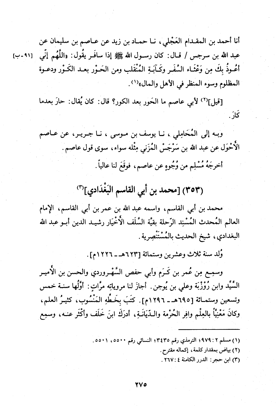 أَنَا أَحْمَدُ بْنُ الْمِقْدَامِ الْعِجْلِيُّ، نَا حَمَّادُ بْنُ زَيْدٍ , عَنْ عَاصِمِ بْنِ سُلَيْمَانَ , عَنْ عَبْدِ اللَّهِ بْنِ سَرْجَسٍ، قَالَ: كَانَ رَسُولُ اللَّهِ صَلَّى اللَّهُ عَلَيْهِ وَسَلَّمَ إِذَا سَافَرَ , يَقُولُ: «اللَّهُمَّ إِنِّي أَعُوذُ بِكَ مِنْ وَعْثَاءِ السَّفَرِ وَكَآبَةِ الْمُنْقَلَبِ وَمِنَ الْحَوَرِ بَعْدَ الْكَوَرِ وَدَعْوَةِ الْمَظْلُومِ وَسُوءِ الْمَنْظَرِ فِي الأَهْلِ وَالْمَالِ» قِيلَ لأَبِي عَاصِمٍ: مَا الْحَوَرُ بَعْدَ الْكَوَرِ؟ قَالَ: كَانَ يُقَالُ حَارَ بَعْدَمَا كَارَ.