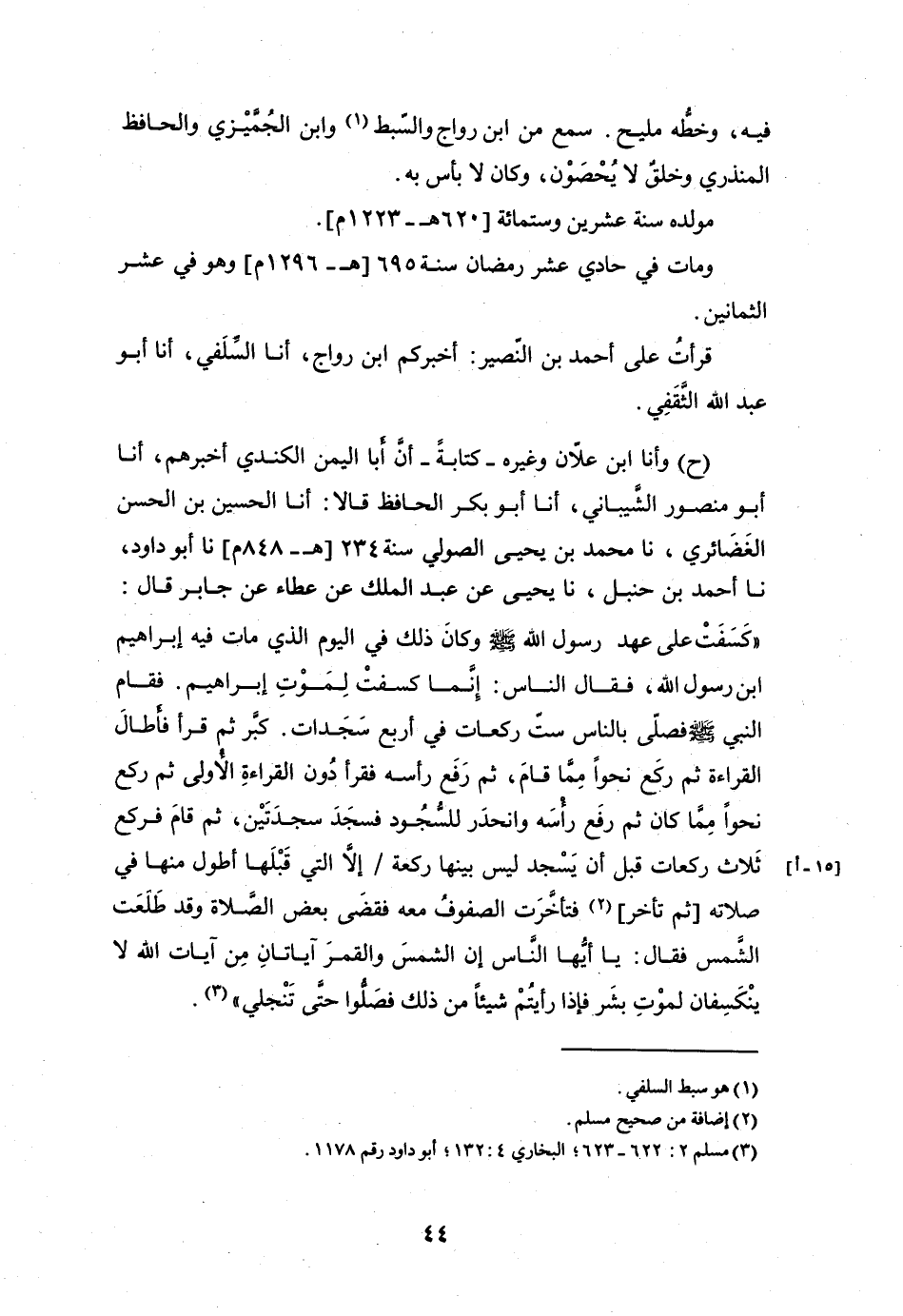 قَرَأْتُ عَلَى أَحْمَدَ بْنِ النَّصِيرِ: أَخْبَرَكُمُ بْنُ رَوَاجٍ، أَنَا السِّلَفِيُّ، أَنَا أَبُو عَبْدِ اللَّهِ الثَّقَفِيُّ، وَأَنَا بْنُ عَلَّانَ , وَغَيْرُهُ، لَنَا أَنَّ أَبَا الْيُمْنِ الْكِنْدِيَّ أَخْبَرَهُمْ، أَنَا أَبُو مَنْصُورٍ الشَّيْبَانِيُّ، أَنَا أَبُو بَكْرٍ الْحَافِظُ، قَالَا: أَنَا الْحُسَيْنُ بْنُ الْحَسَنِ الْغَضَائِرِيُّ، نَا مُحَمَّدُ بْنُ يَحْيَى الصَّوْلِيُّ سَنَةَ 234، نَا أَحْمَدُ بْنُ حَنْبَلَ، نَا يَحْيَى بْنُ عَبْدِ الْمَلِكِ، عَنْ عَطَاءٍ، عَنْ جَابِرٍ، قَالَ: كُسِفَتْ عَلَى عَهْدِ رَسُولِ اللَّهِ صَلَّى اللَّهُ عَلَيْهِ وَسَلَّمَ وَكَانَ ذَلِكَ فِي الْيَوْمِ الَّذِي مَاتَ فِيهِ إِبْرَاهِيمُ ابْنُ رَسُولِ اللَّهِ، فَقَالَ النَّاسُ: إِنَّمَا كُسِفَتْ لِمَوْتِ إِبْرَاهِيمَ.