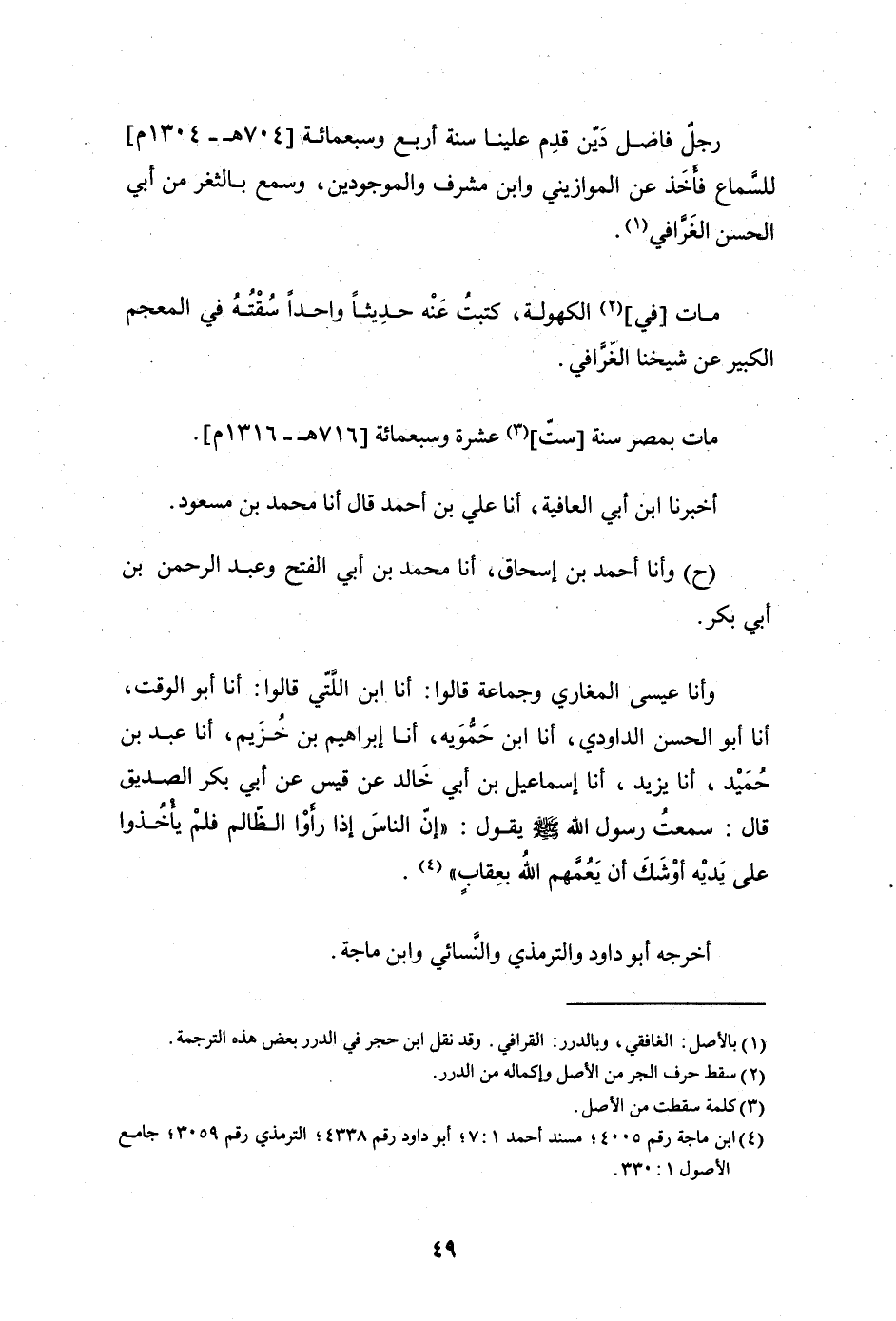 رَجُلٌ فَاضِلٌ دَيِّنٌ قَدِمَ عَلَيْنَا سَنَةَ أَرْبَعٍ وَسَبْعِ مِائَةٍ لِلسَّمَاعِ فَأَخَذَ عَنِ الْمَوَازِينِيِّ , وَابْنِ مُشْرِقٍ , وَالْمَوْجُودِينَ، وَسَمِعَ بِالثُّغْرِ مِنْ أَبِي الْحَسَنِ الْغَرَافِيِّ.