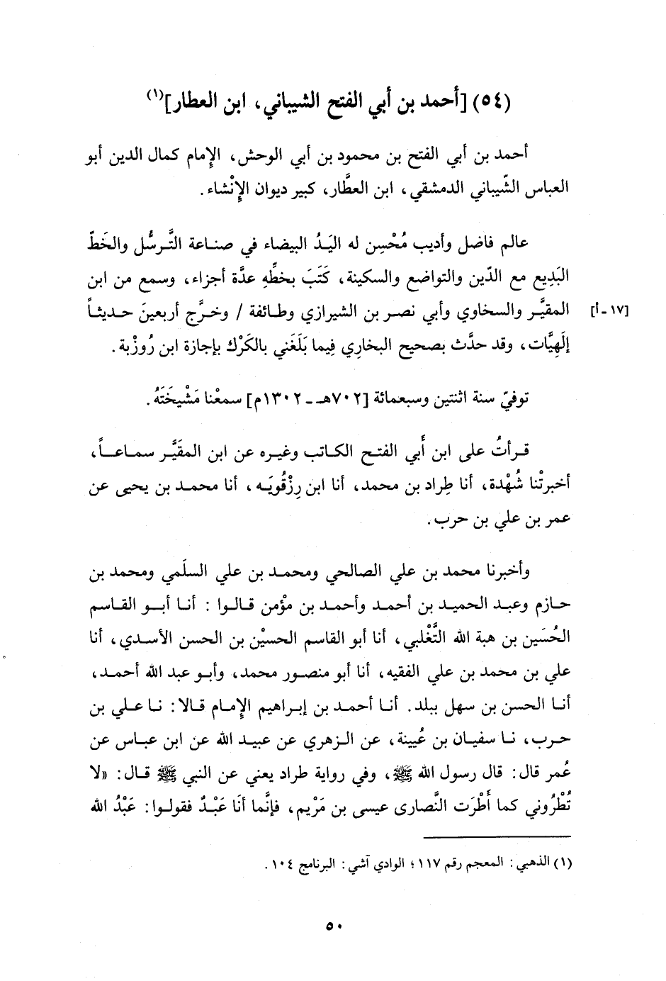 قَرَأْتُ عَلَى أَبِي الْفَتْحِ الْكَاتِبِ , وَغَيْرِهِ , عَنِ ابْنِ الْمُقِيرِ سَمَاعًا، أَخْبَرَتْنَا شَهْدَةُ، أَنَا طَرَّادُ بْنُ مُحَمَّدٍ، أَنَا ابْنُ رِزْقَوَيْهِ، أَنَا مُحَمَّدُ بْنُ يَحْيَى، عَنِ عُمَرَ بْنِ عَلِيِّ بْنِ حَرْبٍ، وَأَخْبَرَنَا مُحَمَّدُ بْنُ عَلِيٍّ الصَّالِحِيُّ، وَمُحَمَّدُ بْنُ عَلِيٍّ السَّلَمِيُّ، وَمُحَمَّدُ بْنُ حَازِمٍّ، وَعَبْدُ الْحَمِيدِ بْنُ أَحْمَدَ، وَأَحْمَدُ بْنُ مُؤْمِنٍ، قَالُوا: أَنَا أَبُو الْقَاسِمِ الْحُسَيْنُ بْنُ هِبَةِ اللَّهِ التَّغْلُبِيُّ، أَنَا أَبُو الْقَاسِمِ الْحُسَيْنُ بْنُ الْحَسَنِ الْأَسَدِيُّ، أَنَا عَلِيُّ بْنُ مُحَمَّدِ بْنُ عَلِيٍّ الْفَقِيهُ، أَنَا أَبُو مَنْصُورٍ مُحَمَّدٌ، وَأَبُو عَبْدِ اللَّهِ أَحْمَدُ، أَنَا الْحَسَنُ بْنُ سَهْلٍ بِبَلَدٍ، أَنَا أَحْمَدُ بْنُ إِبْرَاهِيمَ الْإِمَامُ، قَالَا: نَا عَلِيُّ بْنُ حَرْبٍ، نَا سُفْيَانُ بْنُ عُيَيْنَةَ، عَنِ الزُّهْرِيِّ، عَنْ عُبَيْدِ اللَّهِ، عَنِ ابْنِ الْعَبَّاسِ، عَنْ عُمَرَ، قَالَ: قَالَ رَسُولُ اللَّهِ صَلَّى اللَّهُ عَلَيْهِ وَسَلَّمَ، وَفِي رِوَايَةِ طَرَّادٍ يَعْنِي، عَنِ النَّبِيِّ صَلَّى اللَّهُ عَلَيْهِ وَسَلَّمَ قَالَ: " لَا تُطْرُونِي كَمَا أَطْرَتِ النَّصَارَى عِيسَى ابْنَ مَرْيَمَ، فَإِنَّمَا أَنَا عَبْدٌ، فَقُولُوا: عَبْدُ اللَّهِ