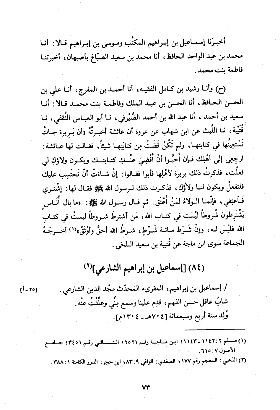 أَخْبَرَنَا إِسْمَاعِيلُ بْنُ إِبْرَاهِيمَ الْمُكْتِبُ، وَمُوسَى بْنُ إِبْرَاهِيمَ، قَالَا: أَنَا مُحَمَّدُ بْنُ عَبْدِ الْوَاحِدِ الْحَافِظُ، أَنَا مُحَمَّدُ بْنُ سَعِيدٍ الصَّبَّاغُ بِأَصْبَهَانَ، أَخْبَرَتْنَا فَاطِمَةُ بِنْتُ مُحَمَّدٍ، وَأَنَا رَشِيدُ بْنُ كَامِلٍ الْفَقِيهُ، أَنا أَحْمَدُ بْنُ الْمُفْرِجُ، أَنَا عَلِيُّ بْنُ الْحَسَنِ الْحَافِظُ، أَنَا الْحَسَنُ بْنُ عَبْدِ الْمَلِكِ، وَفَاطِمَةُ بِنْتُ مُحَمَّدٍ، قَالَا: أَنَا سَعِيدُ بْنُ أَحْمَدَ، أَنَا عَبْدُ اللَّهِ بْنُ أَحْمَدَ الصَّيْرَفِيُّ، نَا أَبُو الْعَبَّاسِ الثَّقَفِيُّ، نَا قُتَيْبَةُ، نَا اللَّيْثُ، عَنِ ابْنِ شِهَابٍ، عَنْ عُرْوَةَ، أَنَّ عَائِشَةَ أَخْبَرَتْهُ أَنَّ بَرِيرَةَ جَاءَتْ تَسْتَعِينُهَا فِي كِتَابَتِهَا، وَلَمْ تَكُنْ فَضَّتْ مِنْ كِتَابَتِهَا شَيْئًا، فَقَالَتْ لَهَا عَائِشَةُ: ارْجِعِي إِلَى أَهْلِكِ فَإِنْ أَحَبُّوا أَنْ أَقْضِيَّ عَنْكِ كِتَابَتَكِ وَيَكُونُ وَلَاؤُكِ لِي فَعَلْتُ، فَذَكَرَتْ ذَلِكَ بَرِيرَةُ لِأَهْلِهَا فَأَبَوْا , فَقَالُوا: إِنْ شَاءَتْ أَنْ تَحْتَسِبَ عَلَيْكِ فَلْتَفْعَلْ وَيَكُونُ لَنَا وَلَاؤُكِ، فَذَكَرَتْ ذَلِكَ لِرَسُولِ اللَّهِ صَلَّى اللَّهُ عَلَيْهِ وَسَلَّمَ , فَقَالَ لَهَا: «اشْتَرِي فَأَعْتِقِي، فَإِنَّمَا الْوَلَاءُ لِمَنْ أَعْتَقَ» .