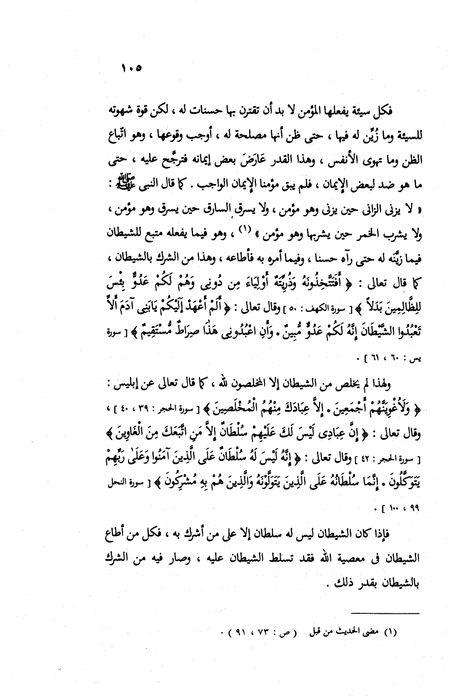 ولهذا لم يخلص من الشيطان إلا المخلصون لله كما قال تعالى: عن إبليس {وَلَأُغْوِيَنَّهُمْ أَجْمَعِينَ. إِلَّا عِبَادَكَ مِنْهُمُ الْمُخْلَصِينَ} وقال تعالى: {إِنَّ عِبَادِي لَيْسَ لَكَ عَلَيْهِمْ سُلْطَانٌ إِلَّا مَنِ اتَّبَعَكَ مِنَ الْغَاوِينَ} وقال تعالى: {إِنَّهُ لَيْسَ لَهُ سُلْطَانٌ عَلَى الَّذِينَ آمَنُوا وَعَلَى رَبِّهِمْ يَتَوَكَّلُونَ. إِنَّمَا سُلْطَانُهُ عَلَى الَّذِينَ يَتَوَلَّوْنَهُ وَالَّذِينَ هُمْ بِهِ مُشْرِكُونَ}
