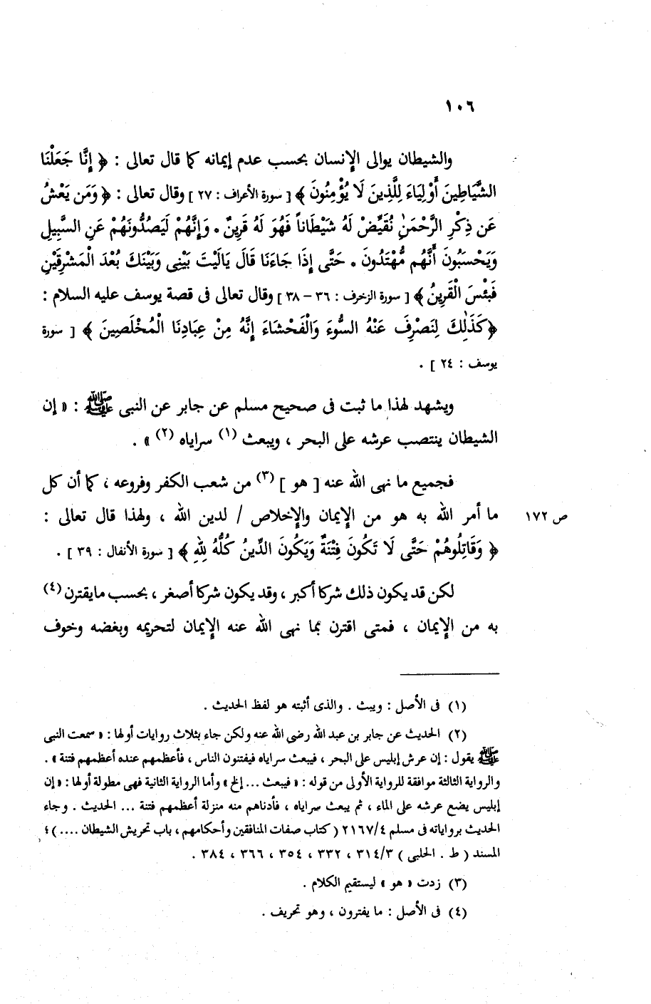 والشيطان يوالي الإنسان بحسب عدم إيمانه كما قال تعالى: {إِنَّا جَعَلْنَا الشَّيَاطِينَ أَوْلِيَاءَ لِلَّذِينَ لا يُؤْمِنُونَ} وقال تعالى: {وَمَنْ يَعْشُ عَنْ ذِكْرِ الرَّحْمَنِ نُقَيِّضْ لَهُ شَيْطَاناً فَهُوَ لَهُ قَرِينٌ. وَإِنَّهُمْ لَيَصُدُّونَهُمْ عَنِ السَّبِيلِ وَيَحْسَبُونَ أَنَّهُمْ مُهْتَدُونَ. حَتَّى إِذَا جَاءَنَا قَالَ يَا لَيْتَ بَيْنِي وَبَيْنَكَ بُعْدَ الْمَشْرِقَيْنِ فَبِئْسَ الْقَرِينُ} وقال تعالى: في قصة يوسف عليه السلام {كَذَلِكَ لِنَصْرِفَ عَنْهُ السُّوءَ وَالْفَحْشَاءَ إِنَّهُ مِنْ عِبَادِنَا الْمُخْلَصِينَ}