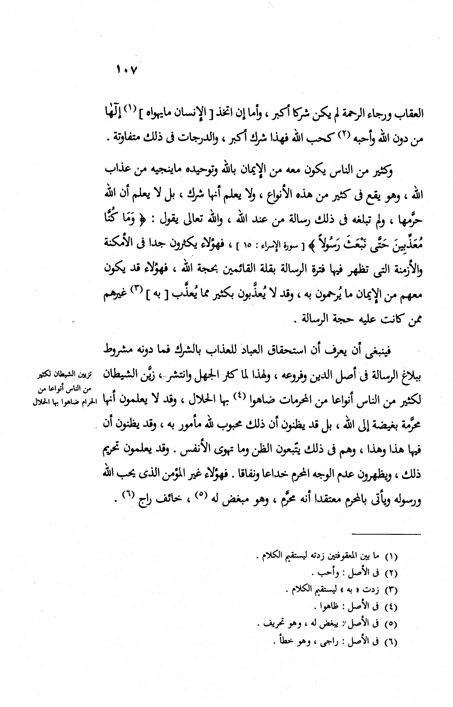 فينبغي أن يعرف أن استحقاق العباد للعذاب بالشرك فما دونه مشروط ببلاغ الرسالة في أصل الدين وفروعه ولهذا لما كثر الجهل وانتشر زين الشيطان لكثير من الناس نواعا من المحرمات ضاهوا بها حلال وقد لا يعلمون أنها محرمة بغيضة إلى الله بل قد يظنون أن ذلك محبوب لله مأمور به وقد يظنون أن فيها هذا وهذا وهم في ذلك يتبعون الظن وما تهوي الأنفس وقد يعلمون تحريم ذلك ويظهرون عدم الوجه المحرم خداعا ونفاقا فهؤلاء غير المؤمن الذي يحب الله ورسوله ويأتي بالمحرم معتقدا أنه محرم وهو مبغض له خائف راج