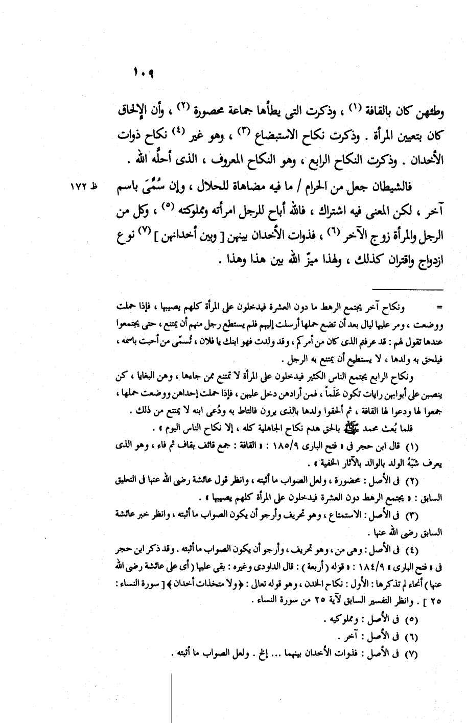 وطئهن كان بالقافة وذكرت التي يطأها جماعة محصورة وأن الإلحاق كان بتعيين المرأة وذكرت نكاح الاستبضاع وهو غير نكاح ذوات الأخدان وذكرت النكاح الرابع وهو النكاح المعروف الذي أحله الله.