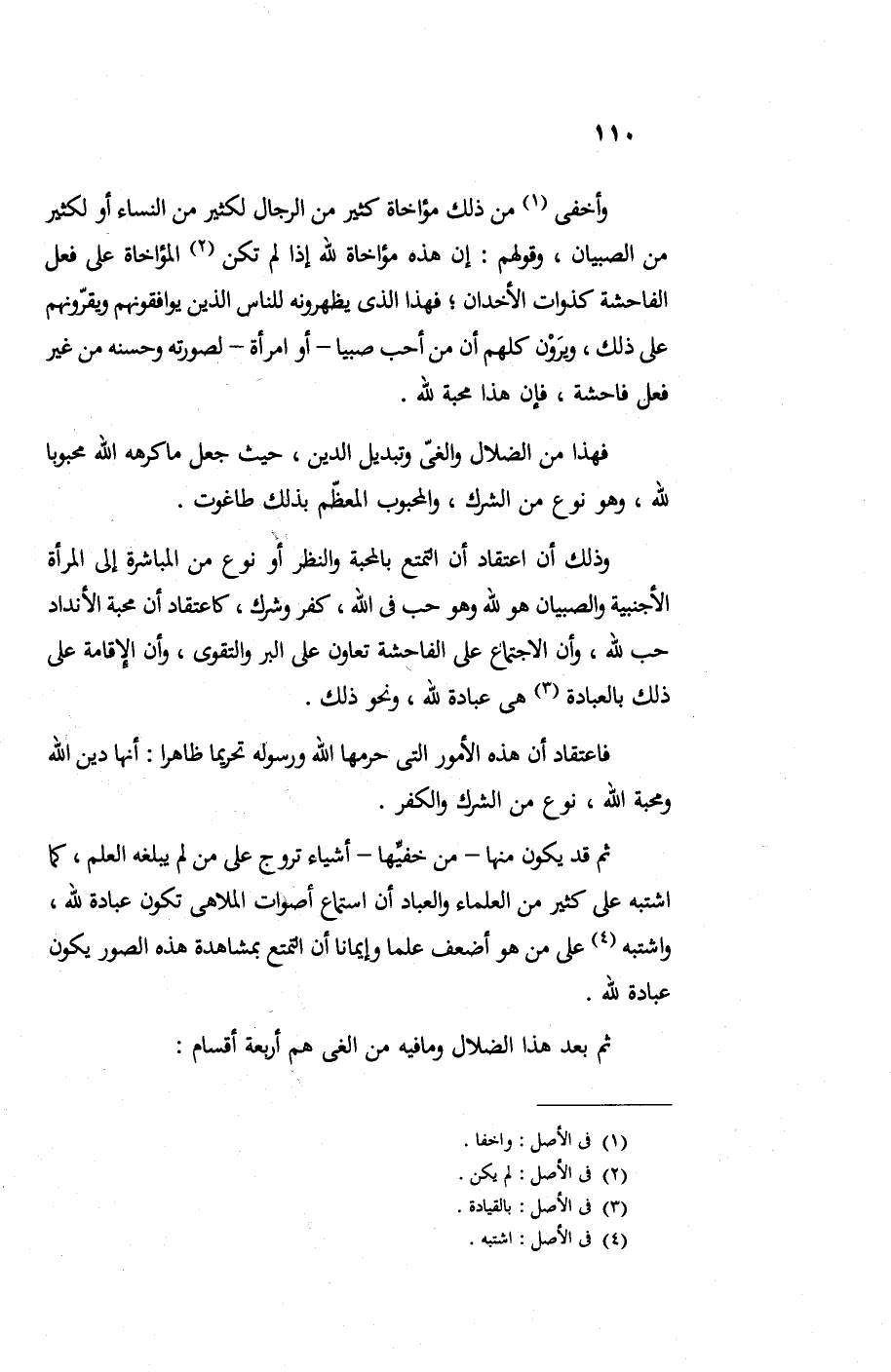 وذلك أن اعتقاد أن التمتع بالمحبة والنظر أو نوع من المباشرة إلى المرأة الأجنبية والصبيان هو لله وهو حب في الله كفر وشرك كاعتقاد أن محبة الأنداد حب لله وأن الاجتماع على الفاحشة تعاون على البر والتقوى وأن الإقامة على ذلك بالعبادة هي عبادة لله ونحو ذلك