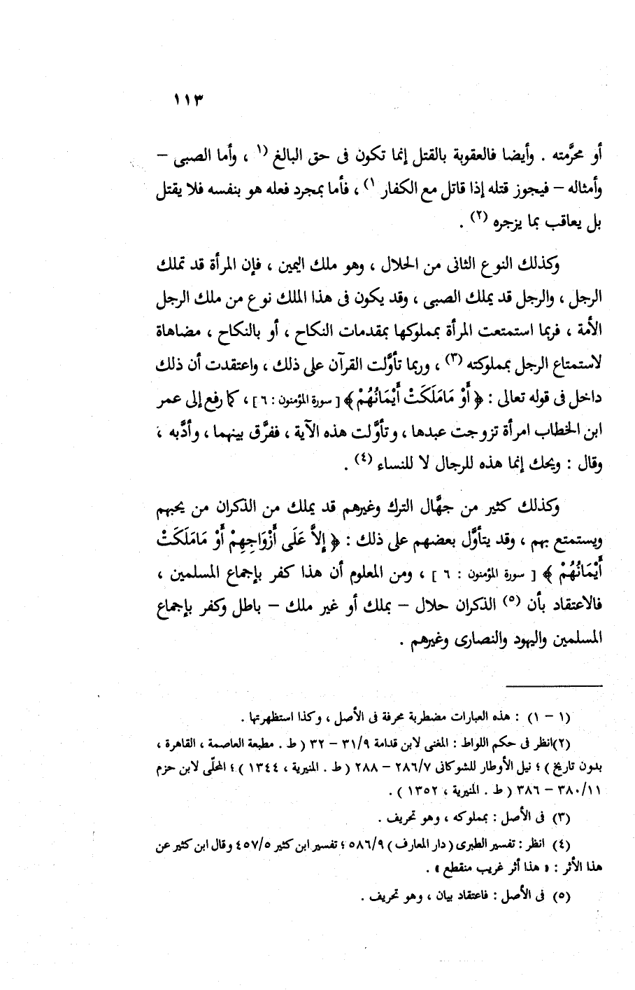 وكذلك النوع الثاني من الحلال وهو ملك اليمين فإن المرأة قد تملك الرجل والرجل قد يملك الصبي وقد يكون في هذا الملك نوع من ملك الرجل الأمة فربما استمتعت المرأة بمملوكها بمقدمات النكاح أو بالنكاح مضاهاة لاستمتاع الرجل بمملوكته وربما تأولت القرآن على ذلك واعتقدت أن ذلك داخل في قوله تعالى {أَوْ مَا مَلَكَتْ أَيْمَانُهُمْ} كما رفع إلى عمر ابن الخطاب امرأة تزوجت عبدها وتأولت هذه الآية ففرق بينهما وأدبه وقال ويحك إنما هذه للرجال لا للنساء