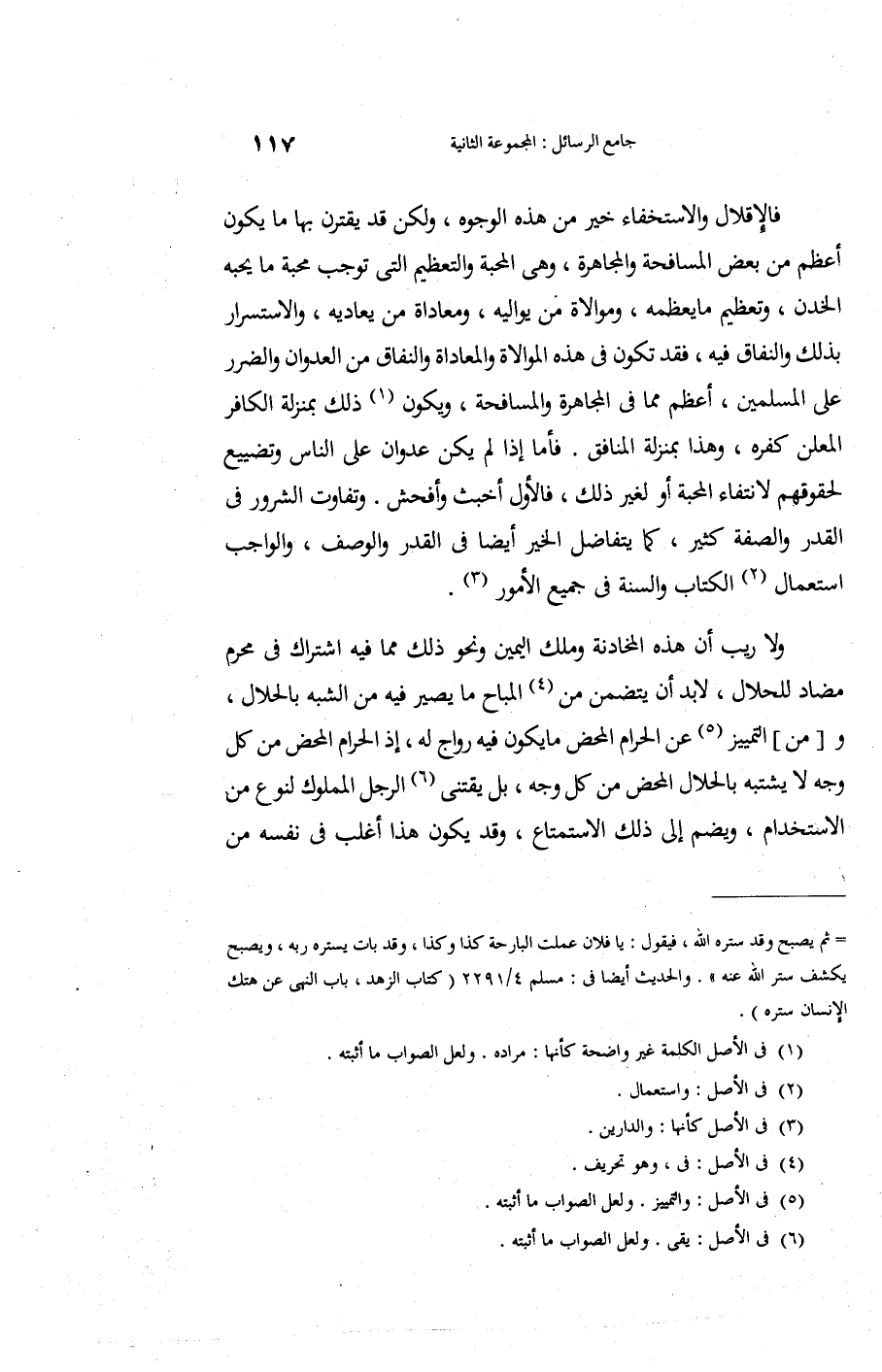 فالإقلال والاستخفاء خير من هذه الوجوه ولكن قد يقترن بها ما يكون أعظم من بعض المسافحة والمجاهرة وهي المحبة والتعظيم التي توجب محبة ما يحبه الخدن وتعظيم ما يعظمه وموالاة من يواليه ومعاداة من يعاديه والاستسرار بذلك والنفاق فيه فقد تكون في هذه الموالاة والمعاداة والنفاق من العدوان والضرر على المسلمين أعظم مما في المجاهرة والمسافحة ويكون ذلك بمنزلة الكافر المعلن كفره وهذا بمنزلة المنافق فأما إذا لم يكن عدوان على الناس وتضييع لحقوقهم لانتفاء المحبة أو لغير ذلك فالأول أخبث وأفحش وتفاوت الشرور في القدر والصفة كثير كما يتفاضل الخير أيضا في القدر والوصف والواجب استعمال الكتاب والسنة في جميع الأمور