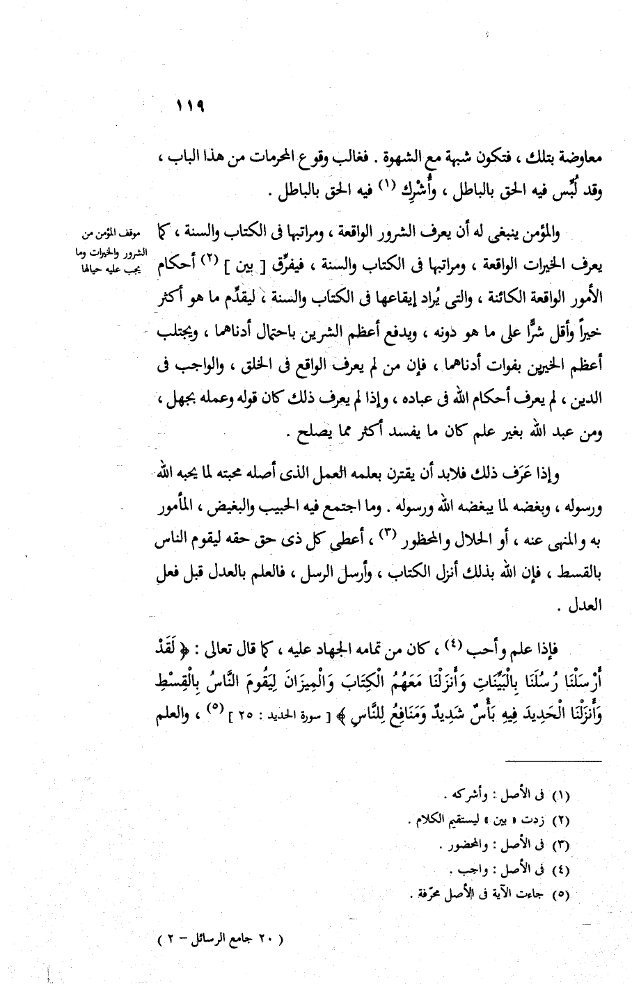 فإذا علم وأحب كان من تمامه الجهاد عليه كما قال تعالى: {لَقَدْ أَرْسَلْنَا رُسُلَنَا بِالْبَيِّنَاتِ وَأَنْزَلْنَا مَعَهُمُ الْكِتَابَ وَالْمِيزَانَ لِيَقُومَ النَّاسُ بِالْقِسْطِ وَأَنْزَلْنَا الْحَدِيدَ فِيهِ بَأْسٌ شَدِيدٌ وَمَنَافِعُ لِلنَّاسِ} والعلم