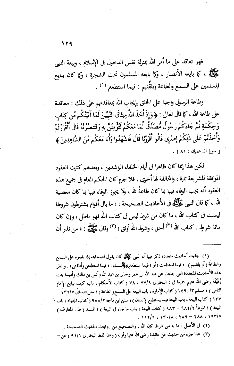 لكن هذا إنما كان ظاهرا في أيام الخلفاء الراشدين وبعدهم كثرت العقود الموافقة للشريعة تارة والمخالفة لها أخري فلا جرم كان الحكم العام في جميع هذه العقود أنه يجب الوفاء فيها بما كان طاعة لله ولا يجوز الوفاء فيها بما كان معصية لله كما قال النبي صلى الله عليه وسلم في الأحاديث الصحيحة: "ما بال أقوام يشترطون شروطا ليست في كتاب الله ما كان من شرط ليس في كتاب الله فهو باطل وإن كان مائة شرط كتاب الله أحق وشرط الله أوثق" وقال: "من نذر أن