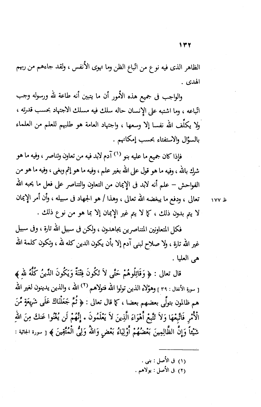 فإذا كان جميع ما عليه بنو آدم لابد فيه من تعاون وتناصر وفيه ما هو شرك بالله وفيه ما هو قول على الله بغير علم وفيه ما هو إثم وبغى وفيه ما هو من الفواحش علم أنه لابد في الإيمان من التعاون والتناصر على فعل ما يحبه الله تعالى ودفع ما يبغضه الله تعالى وهذا هو الجهاد في سبيله وأن أمر الإيمان لا يتم بدون ذلك كما لا يتم غير الإيمان إلا بما هو من نوع ذلك