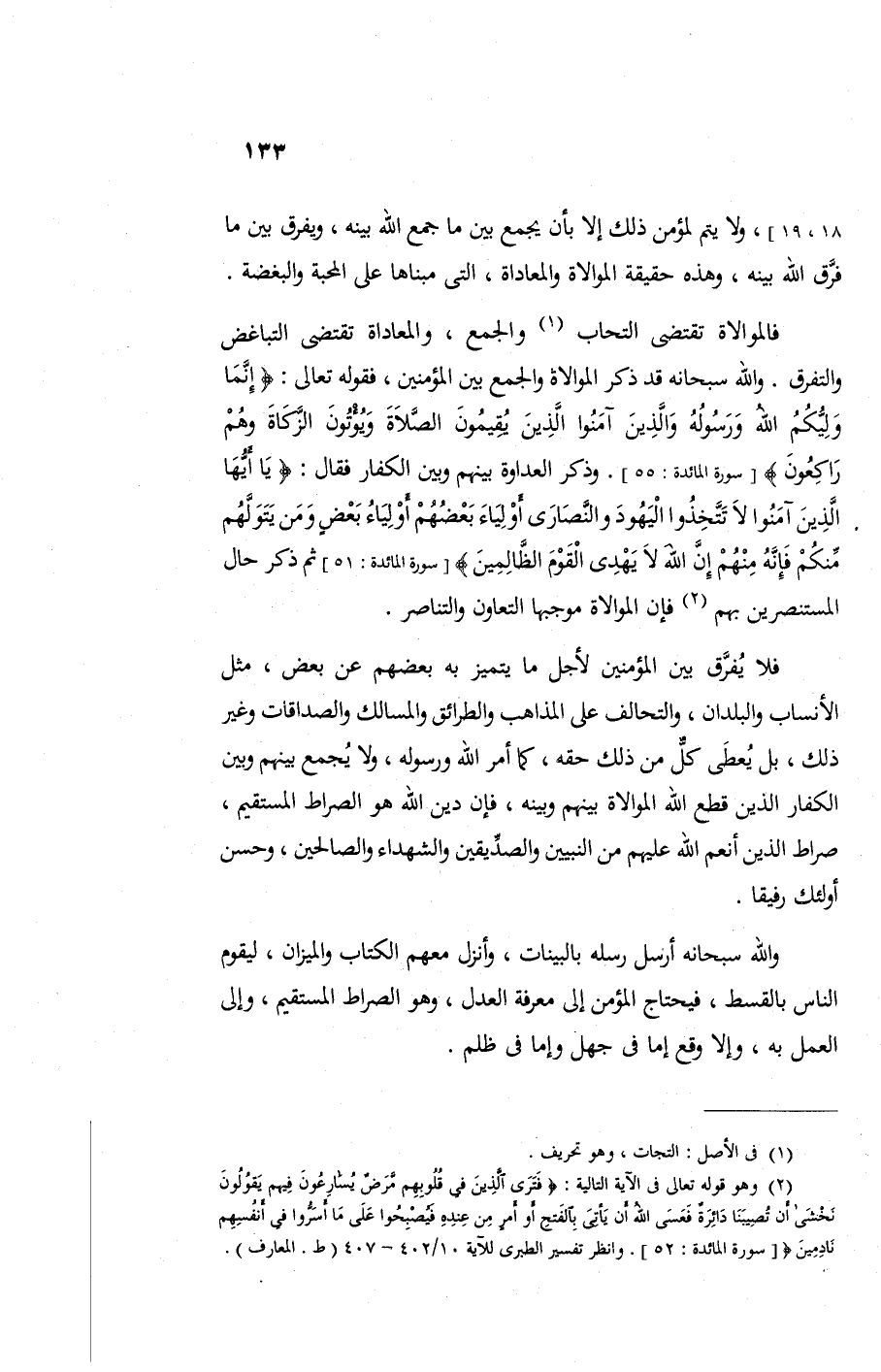 فالموالاة تقتضى التحاب والجمع والمعاداة تقتضى التباغض والتفرق والله سبحانه قد ذكر الموالاة والجمع بين المؤمنين فقولة تعالى {إِنَّمَا وَلِيُّكُمُ اللَّهُ وَرَسُولُهُ وَالَّذِينَ آمَنُوا الَّذِينَ يُقِيمُونَ الصَّلاةَ وَيُؤْتُونَ الزَّكَاةَ وَهُمْ رَاكِعُونَ} وذكر العداوة بينهم وبين الكفار فقال {يَا أَيُّهَا الَّذِينَ آمَنُوا لا تَتَّخِذُوا الْيَهُودَ وَالنَّصَارَى أَوْلِيَاءَ بَعْضُهُمْ أَوْلِيَاءُ بَعْضٍ وَمَنْ يَتَوَلَّهُمْ مِنْكُمْ فَإِنَّهُ مِنْهُمْ إِنَّ اللَّهَ لا يَهْدِي الْقَوْمَ الظَّالِمِينَ} ثم ذكر حال المستنصرين بهم فإن الموالاة موجبها التعاون والتناصر