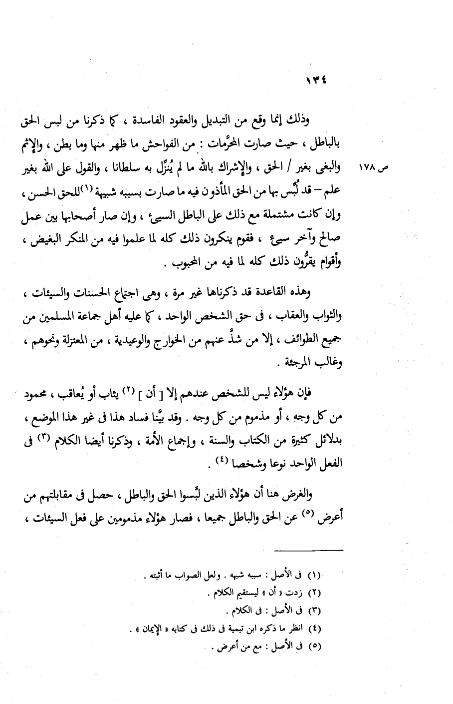 وذلك إنما وقع من التبديل والعقود الفاسدة كما ذكرنا من لبس الحق بالباطل حيث صارت المحرمات من الفواحش ما ظهر منها وما بطن والإثم والبغي بغير الحق والإشراك بالله ما لم ينزل به سلطانا والقول على الله بغير علم قد لبس بها من الحق المأذون فيه ما صارت بسببه شبيهة للحق الحسن وإن كانت مشتملة مع ذلك على الباطل السيئ وإن صار أصحابها بين عمل صالح وآخر سيئ فقوم ينكرون ذلك كله لما علموا فيه من المنكر البغيض وأقوام يقرون ذلك كله لما فيه من المحبوب